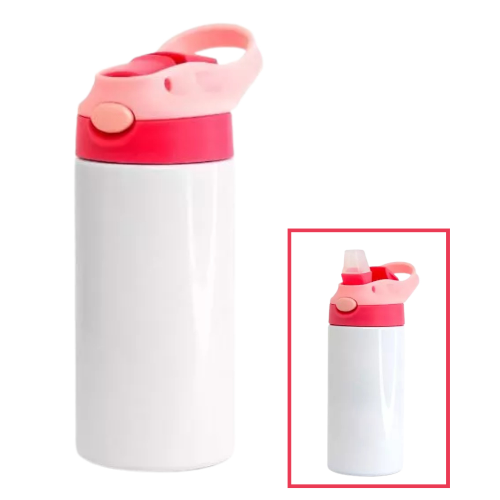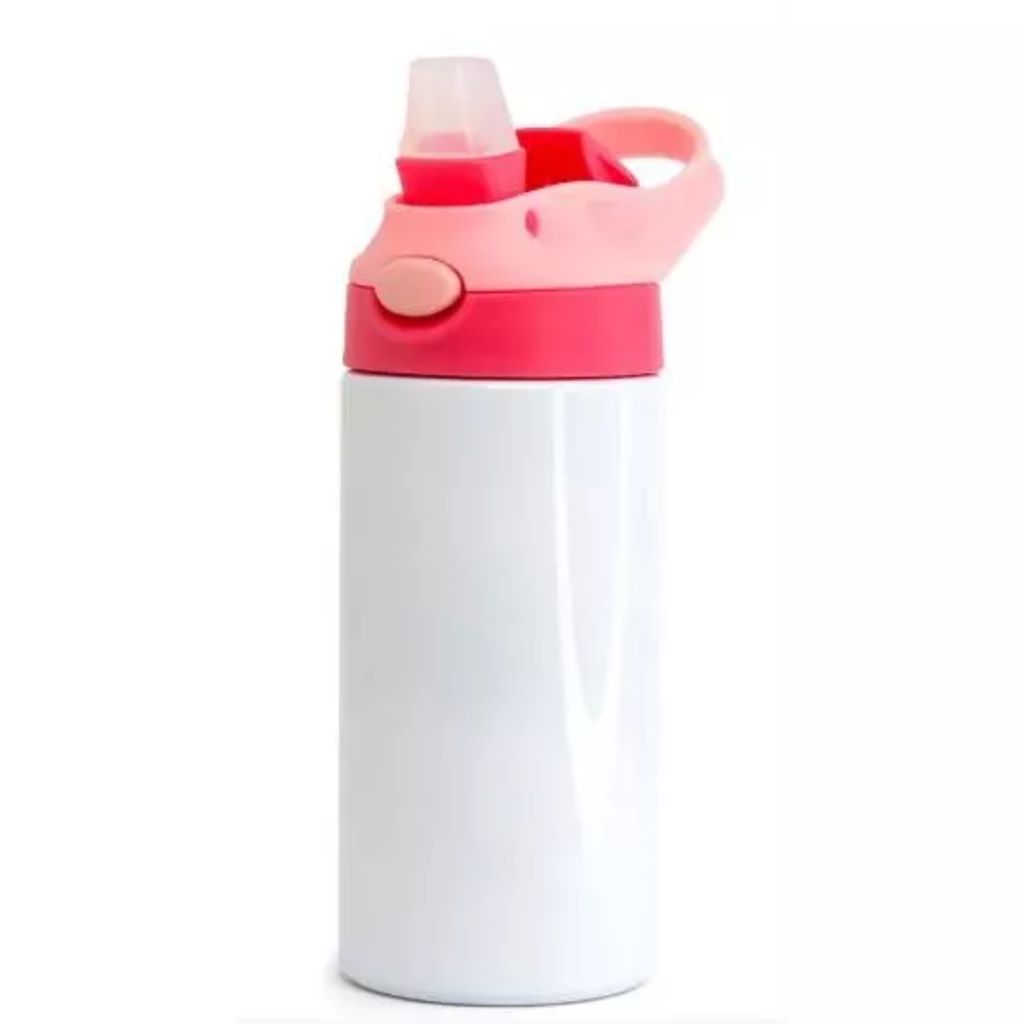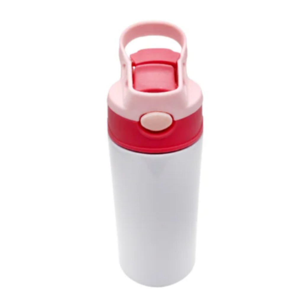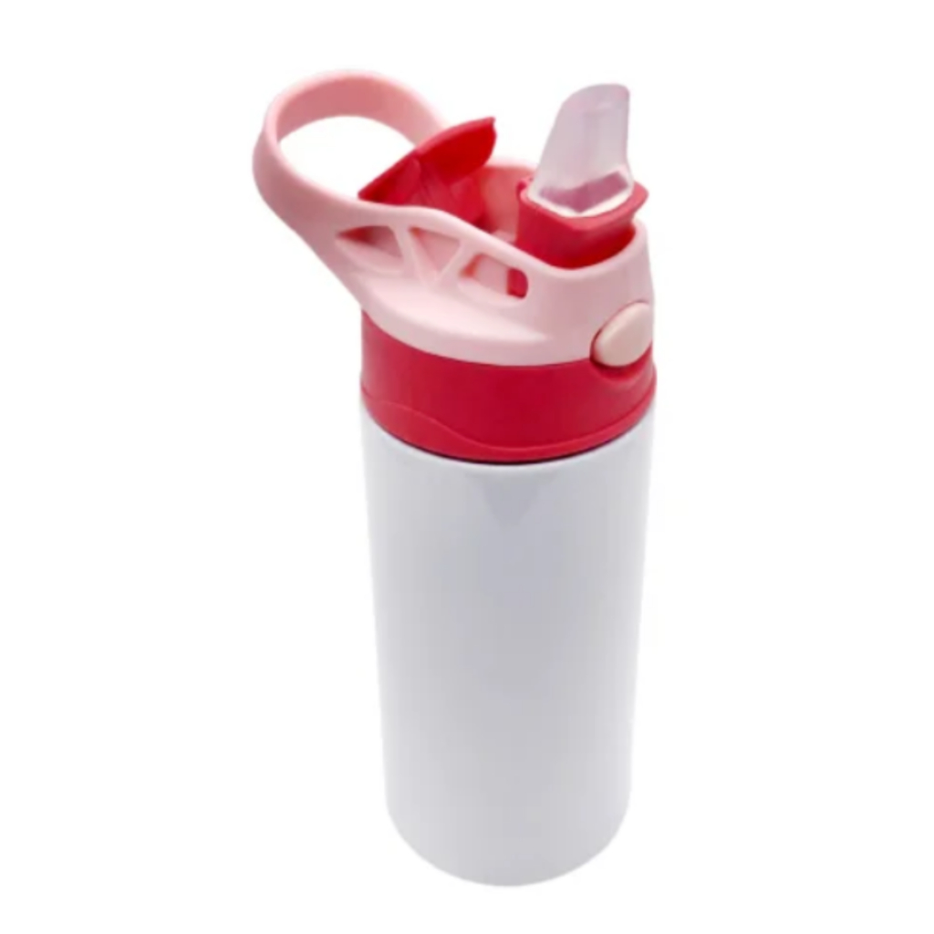 KIT 03 - Garrafa Squeeze Infantil Alumínio Branco com Bico Automático Tampa Vermelho e Alça Rosa 500ml