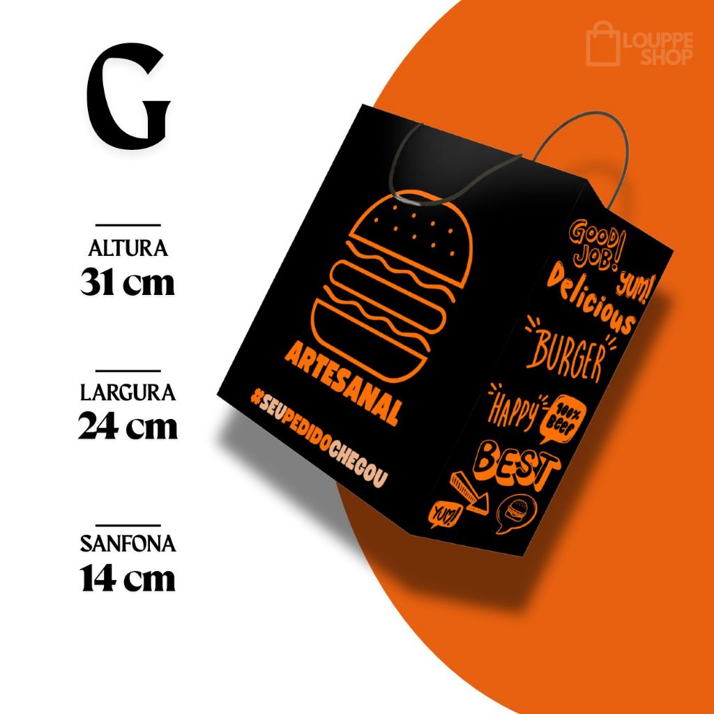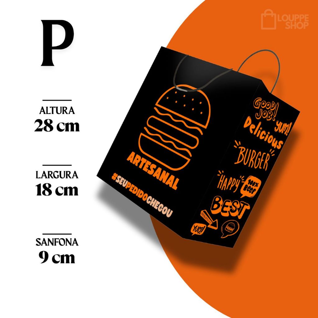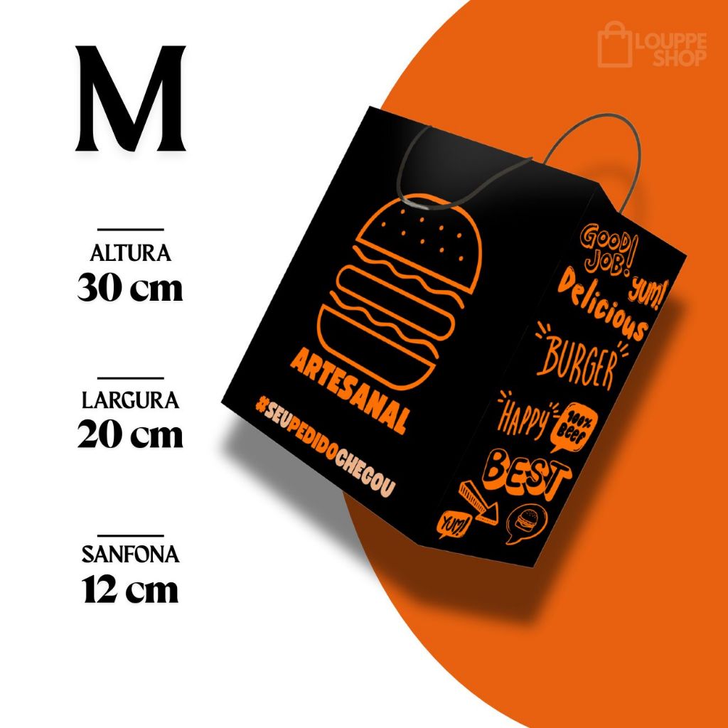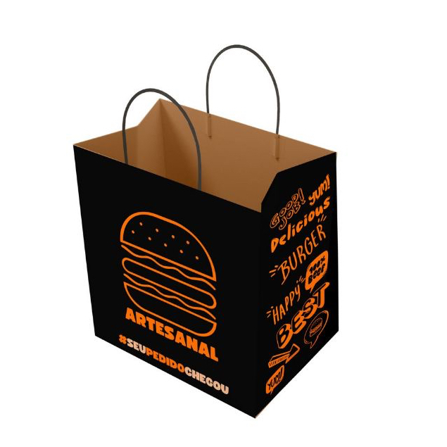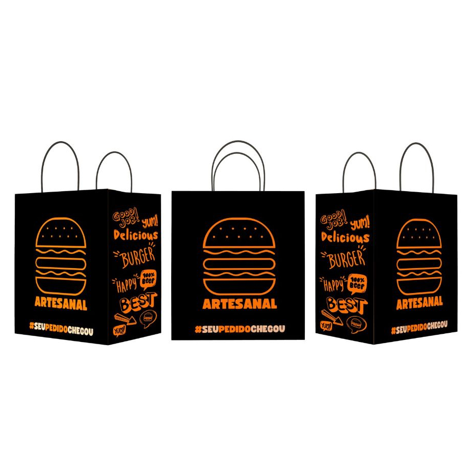 Sacola Kraft Preta Com Alça Para Hamburguer C/ 50 Unid - Lanches, Burguer Artesanal, Gourmet, Black