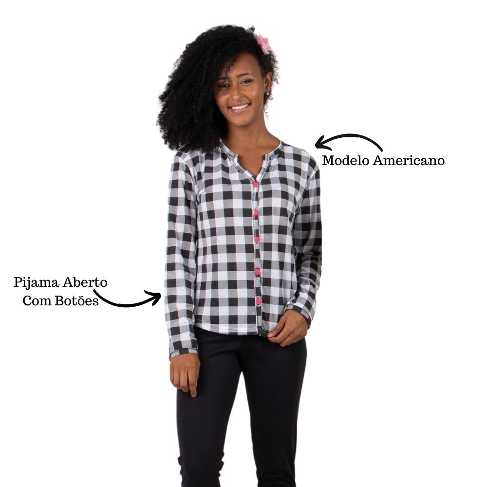 Conjunto Pijama Feminino Aberto Camisa e Calca Longa Xadrez Com Botoes Confortavel Para o Inverno