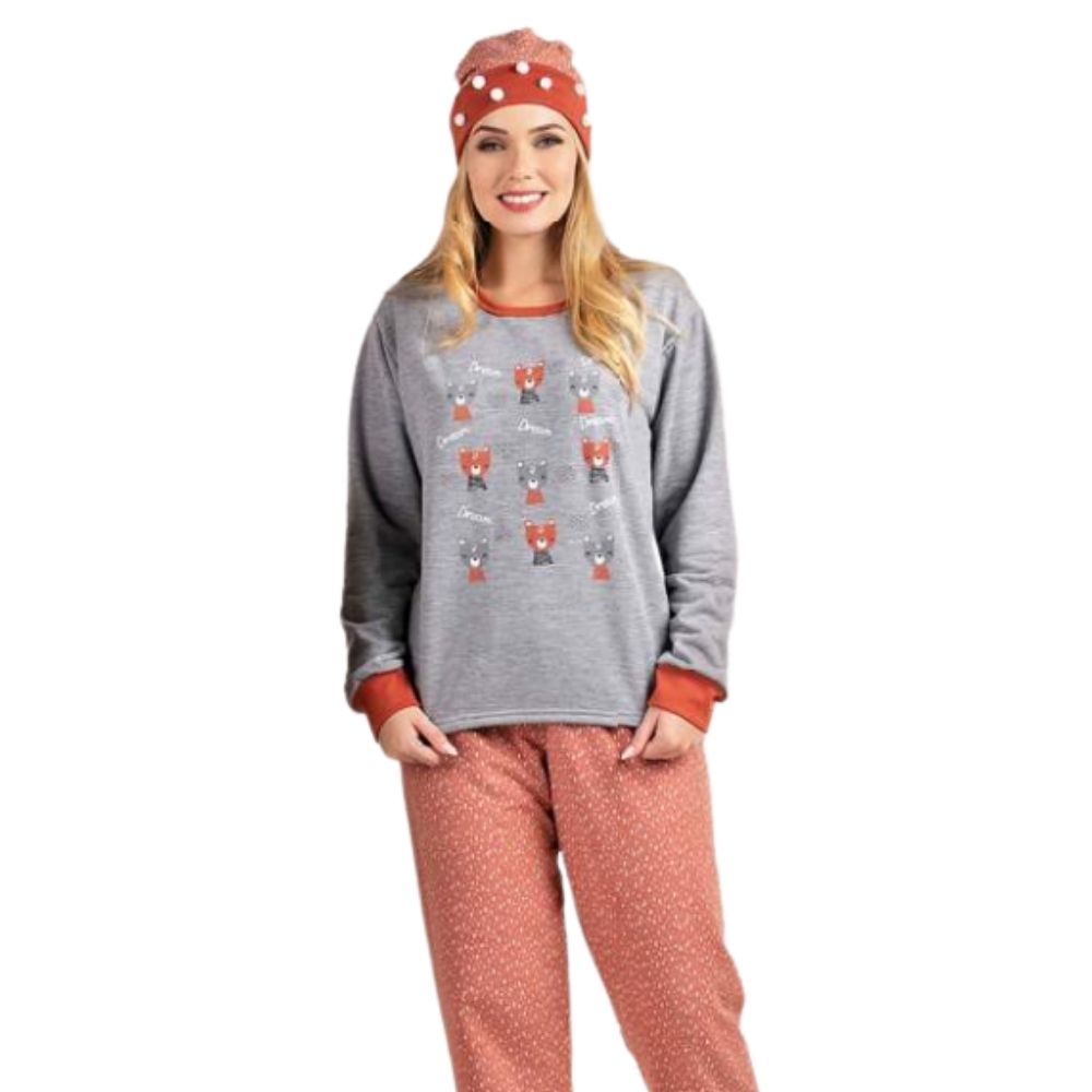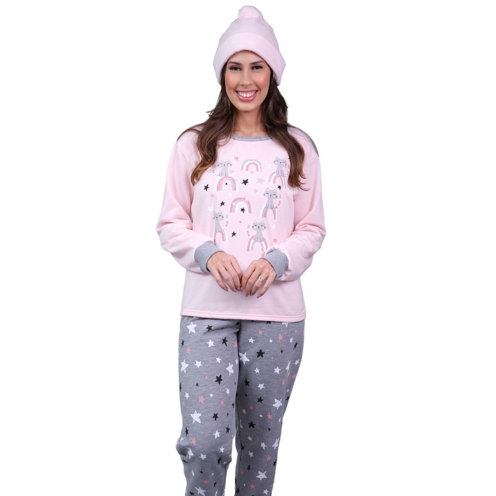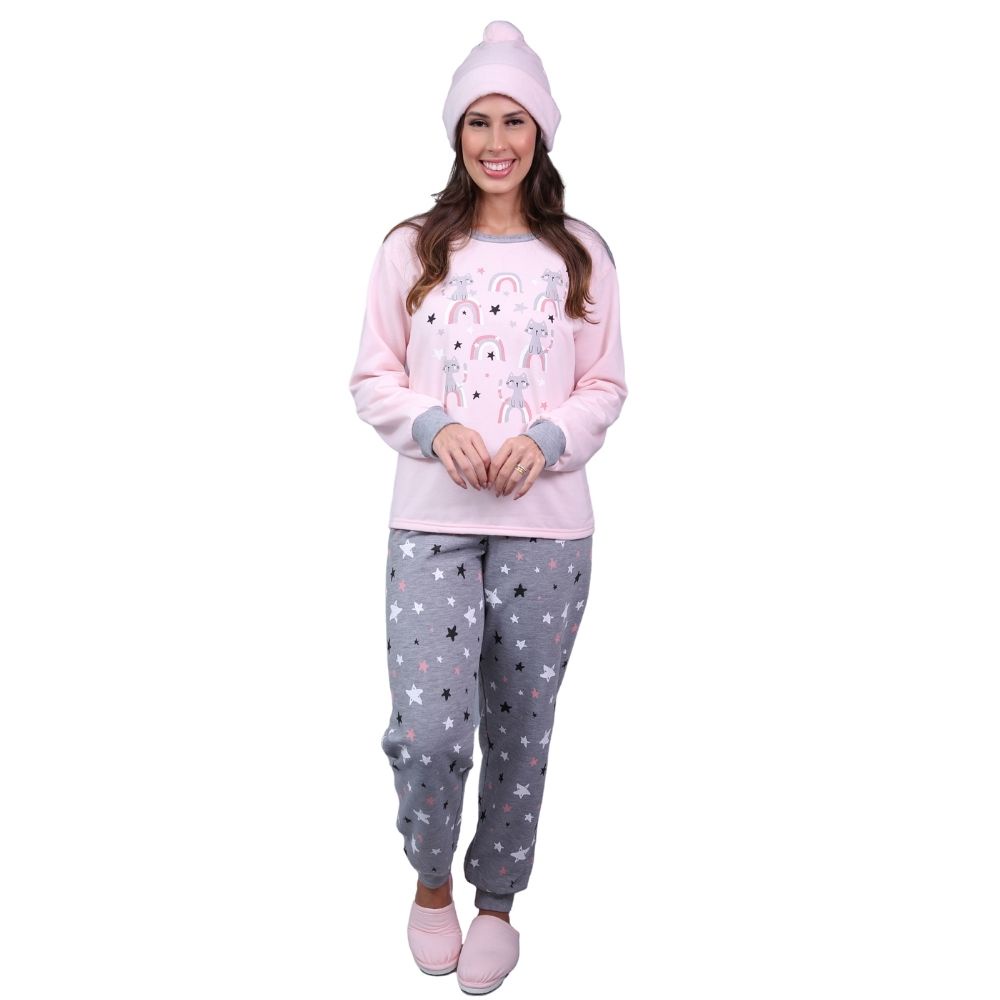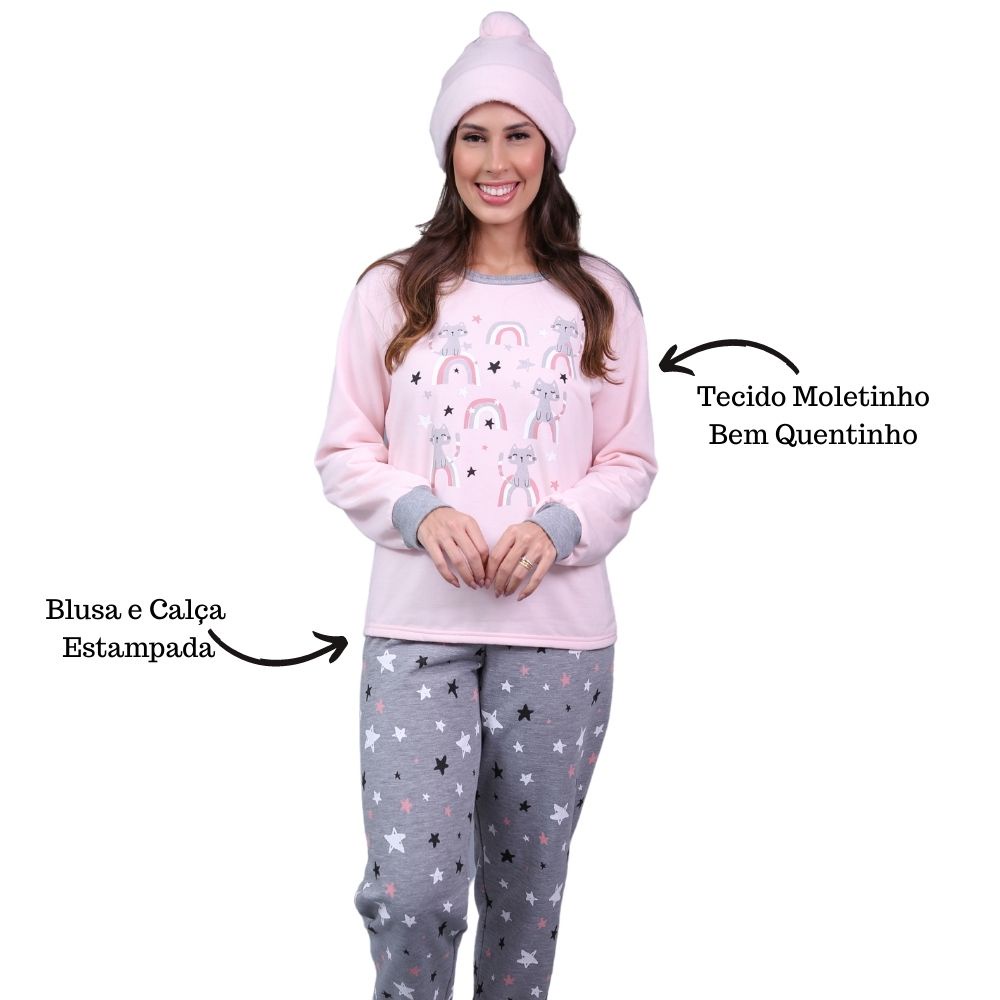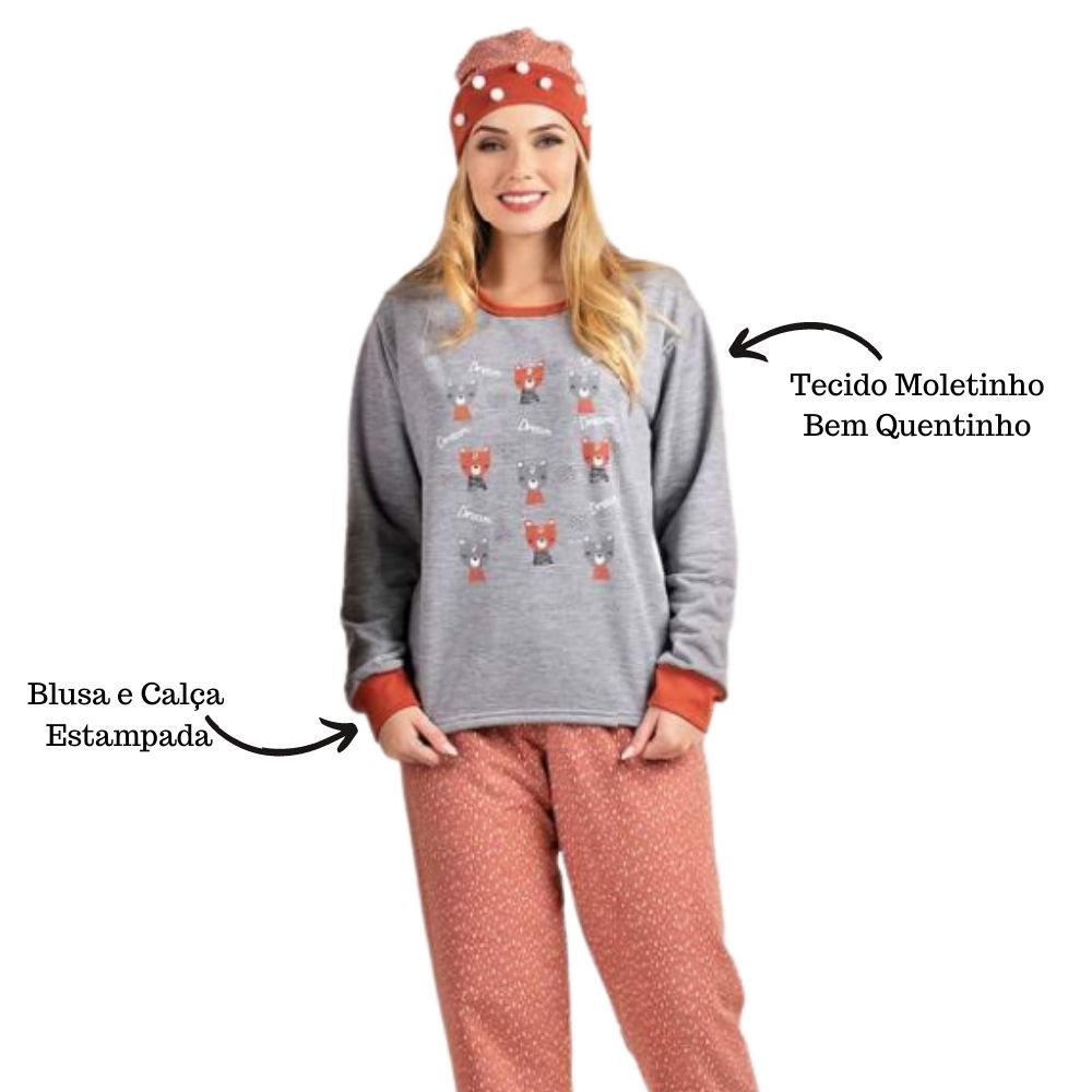 Pijama Feminino De inverno Moletinho Flanelado Blusa Manga Longa e calca Longa Estampado Quentinho