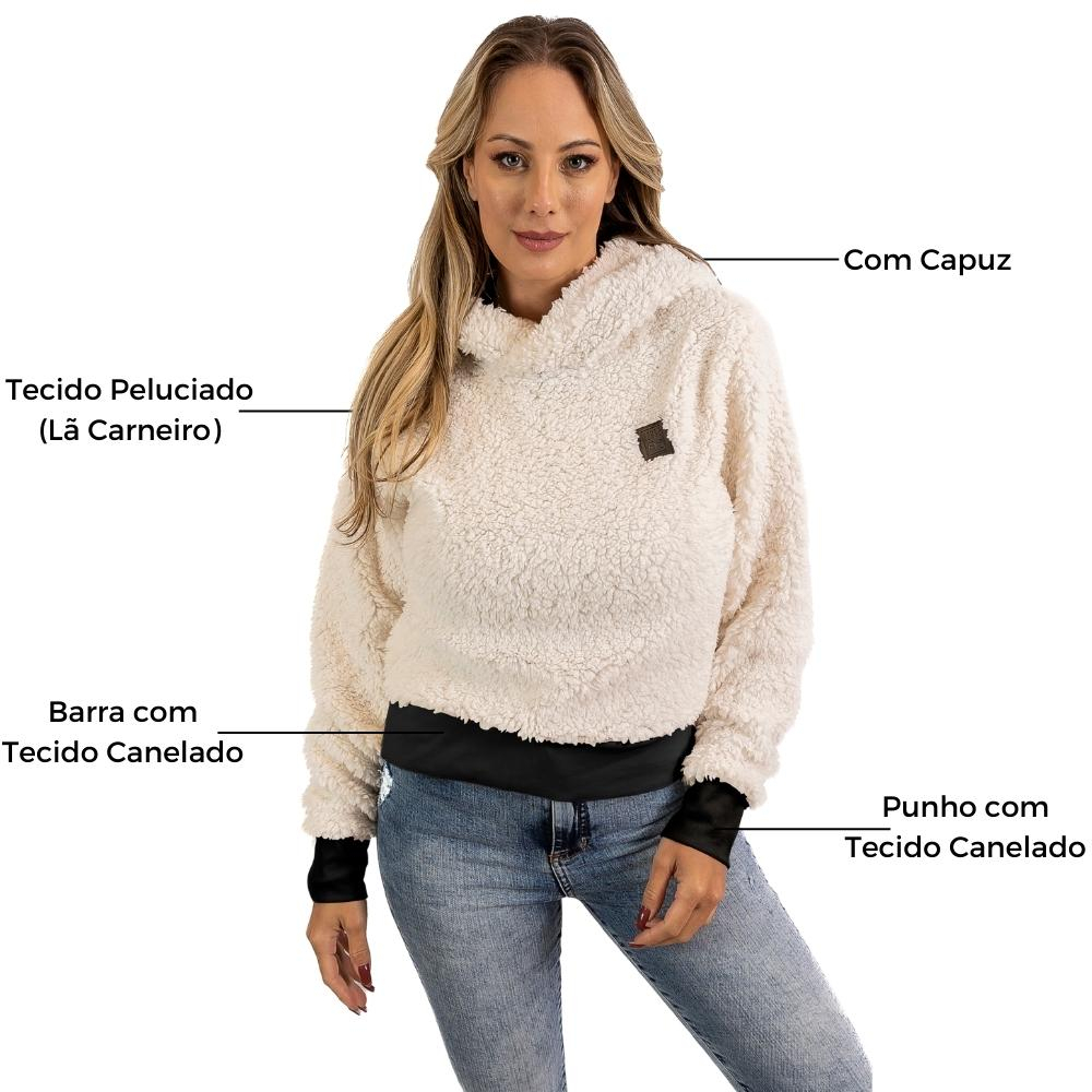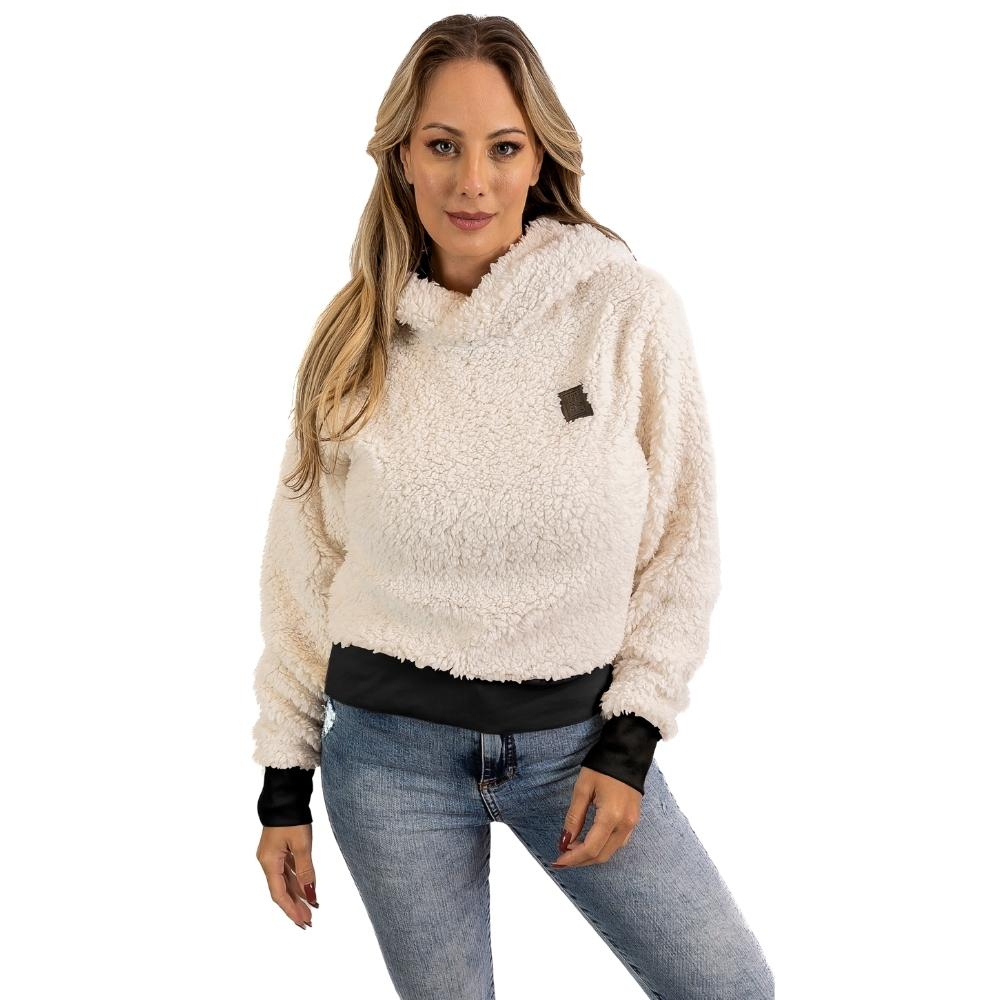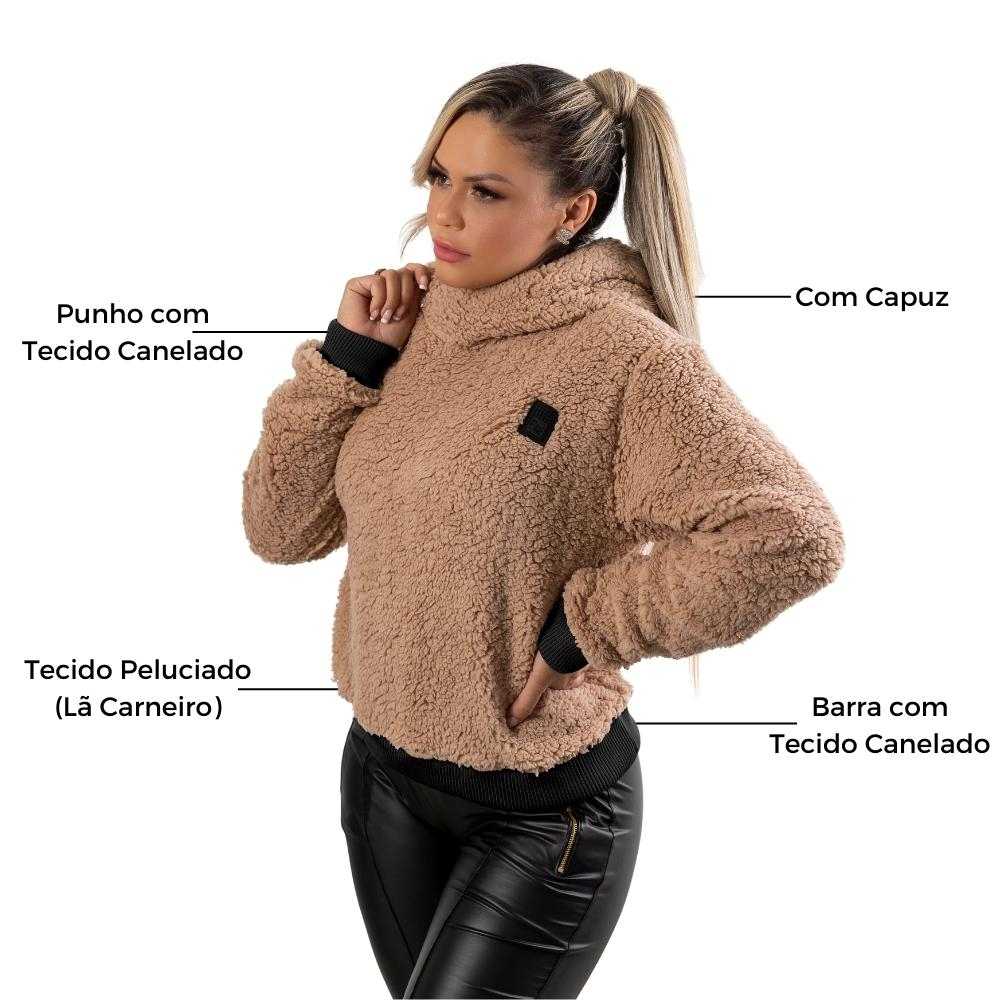 Blusa Feminina Manga Longa Tecido Teddy La Carneiro com Capuz Forrado Adulto Confortavel Peluciado