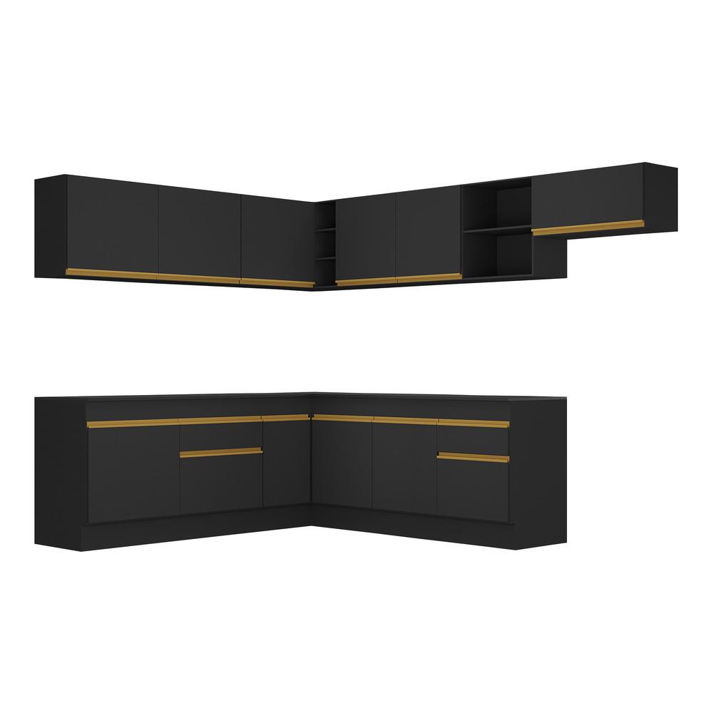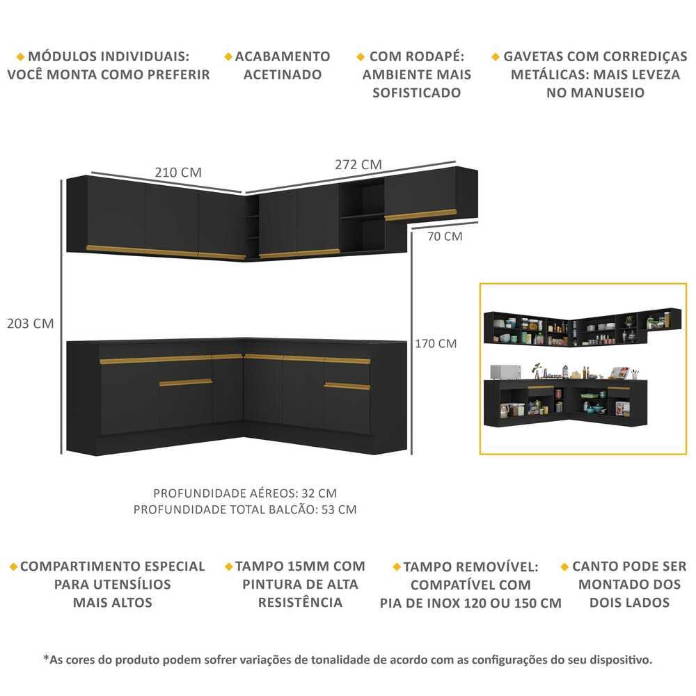 Cozinha Completa de Canto com Rodapé Veneza Multimóveis MP2103 com Armário e Balcão Preta