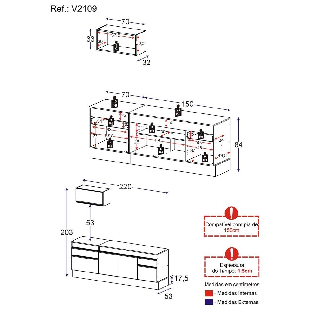 Armário de Cozinha Compacta 220cm com Rodapé Veneza Multimóveis V2109