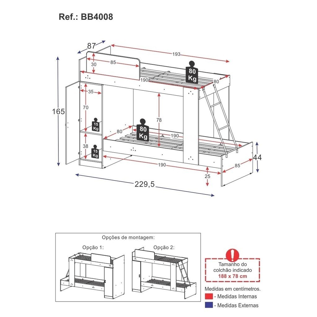 Beliche com Armário 1 Porta para Colchão 78x188cm Cocada Multimóveis BB4008