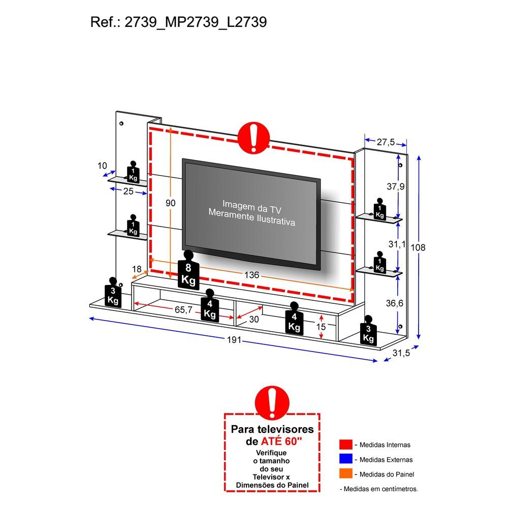 Painel p/ TV 60" com prateleiras de vidro Braga Multimóveis
