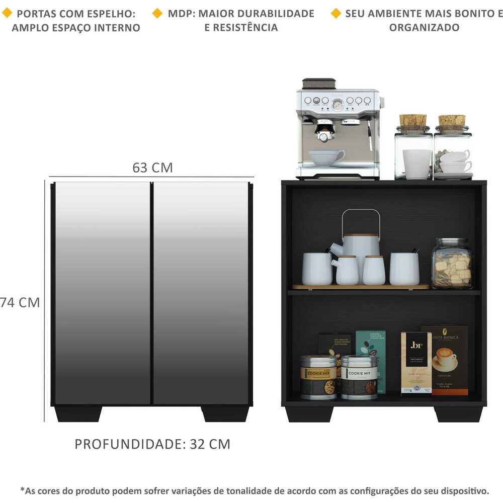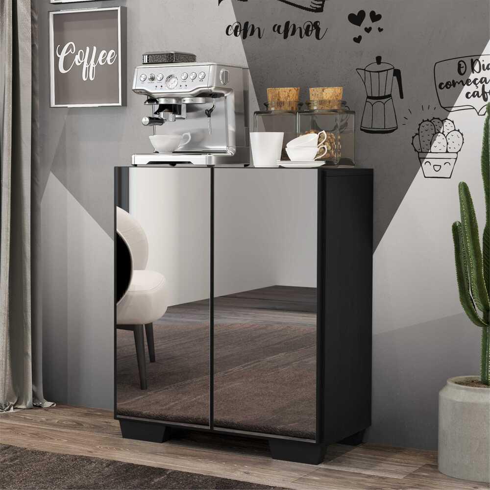 Aparador Cantinho do Café com Espelho e Pés Quadrados 2 Portas Multimóveis Preto