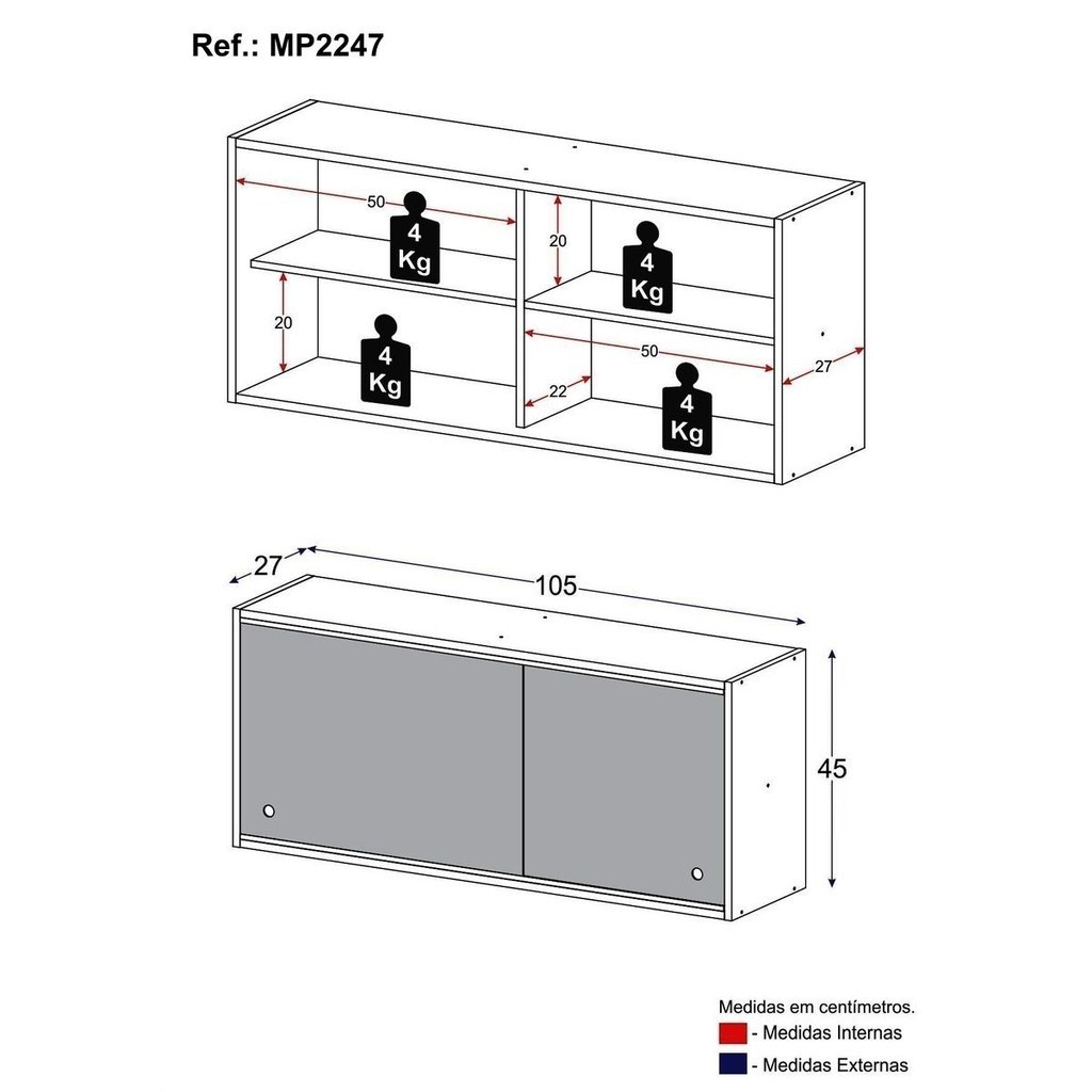 Armário de Cozinha Aéreo 105cm 2 Portas de Correr em Vidro Xangai Multimóveis MP2247