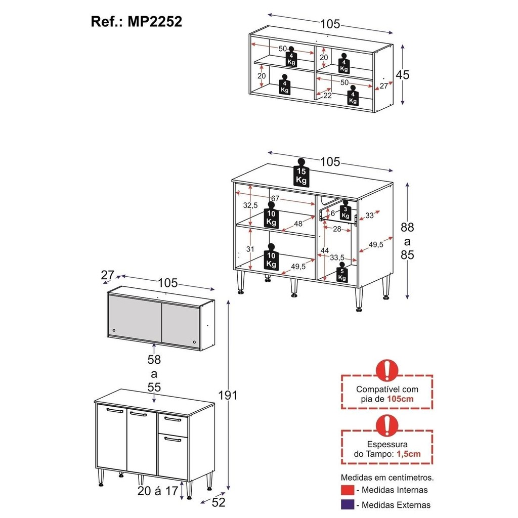 Armário de Cozinha Aéreo com Balcão para Pia 105cm Siena Multimóveis MP2252