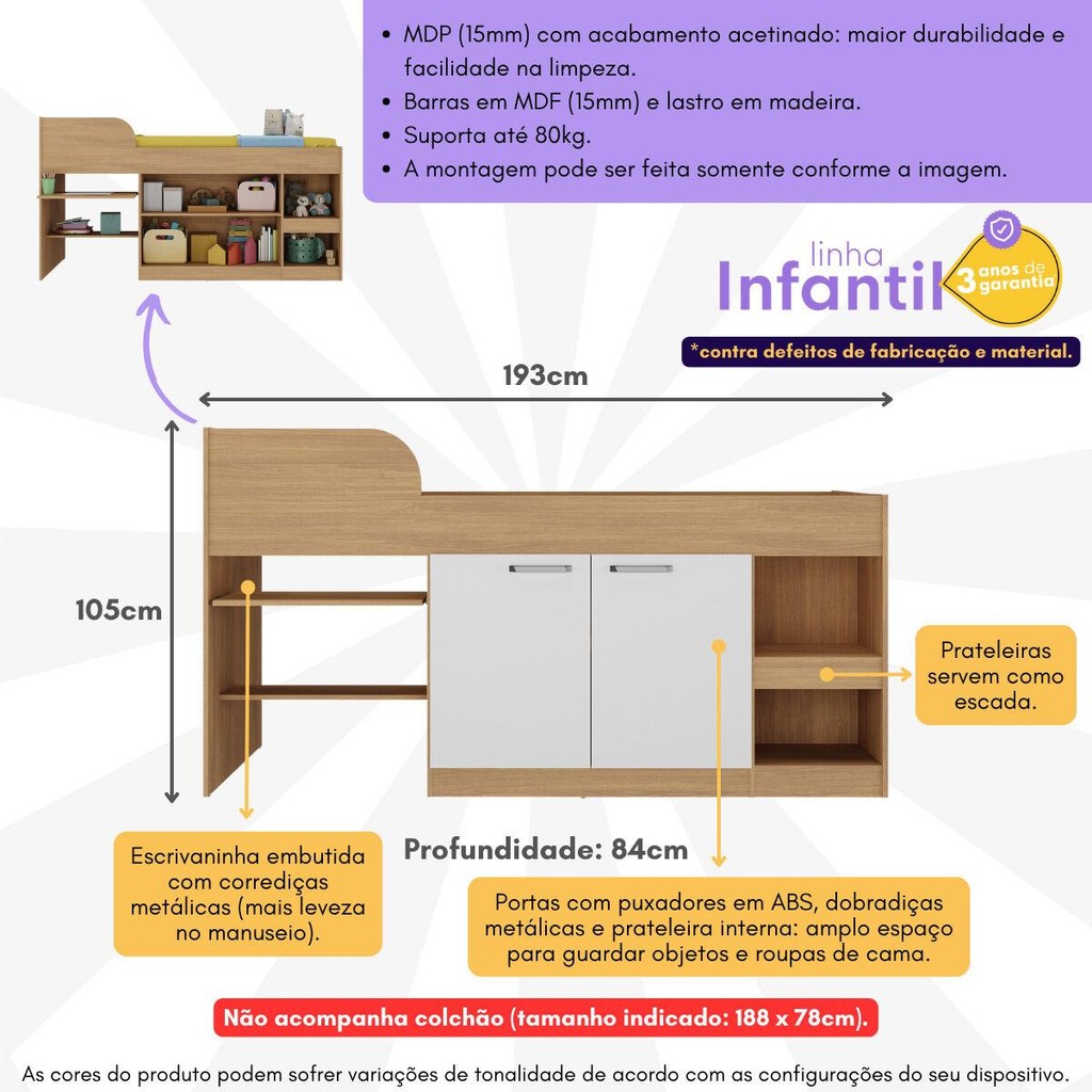 Cama Solteiro Multifuncional para Colchão 188 x 78cm com 2 Portas e Escrivaninha Multimóveis MP4230