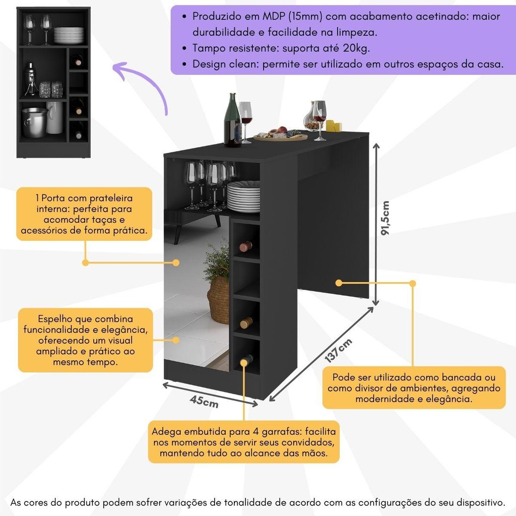 Bancada Balcão/Mesa de Cozinha com Adega 1 Porta e Espelho Multimóveis MP2248
