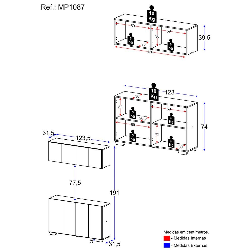 Kit Bar Armário Aéreo e Aparador 4 Portas Multimóveis MP1087