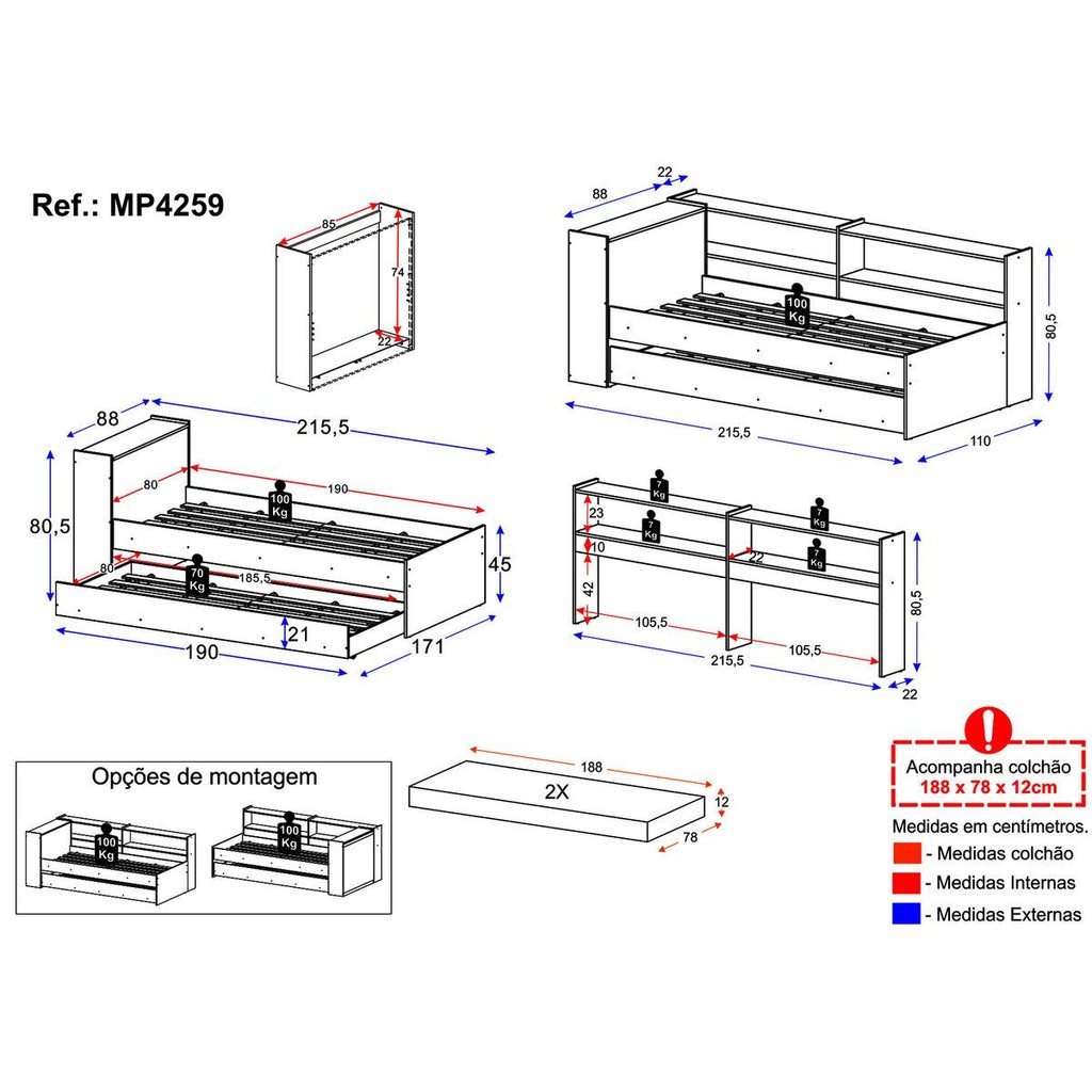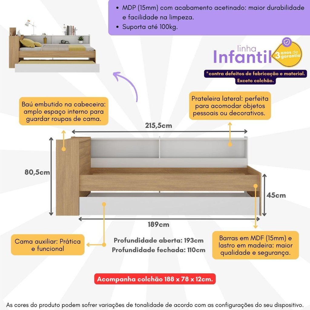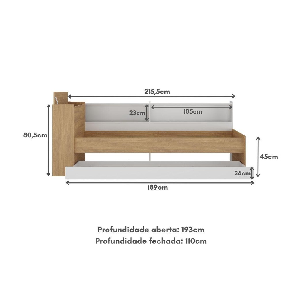 Bicama de Solteiro com Colchão Incluso Baú Embutido e Prateleira Multimóveis MP4259