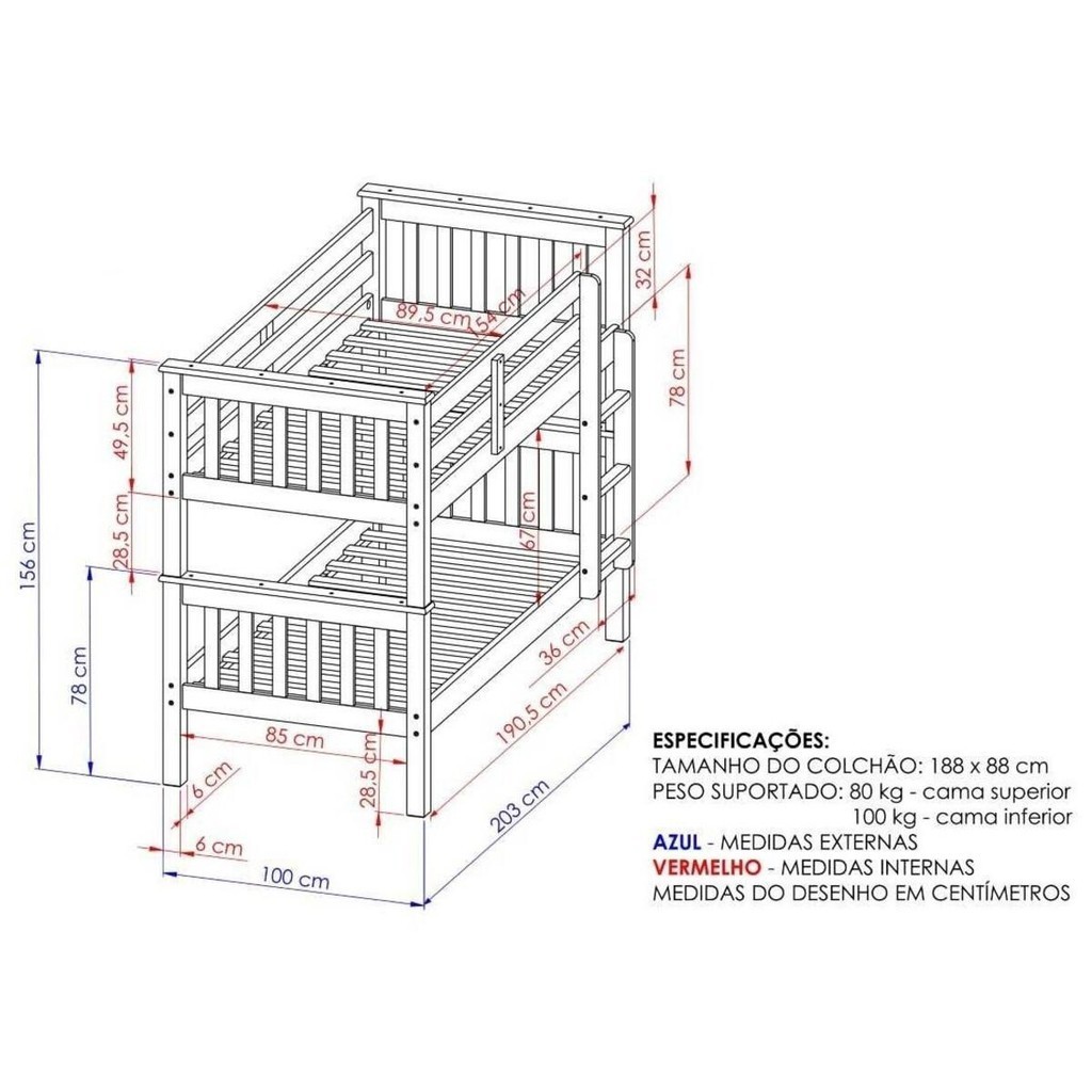 Beliche de Solteiro Madeira Maciça para Colchão 88 x 188 cm Multimóveis CR35207