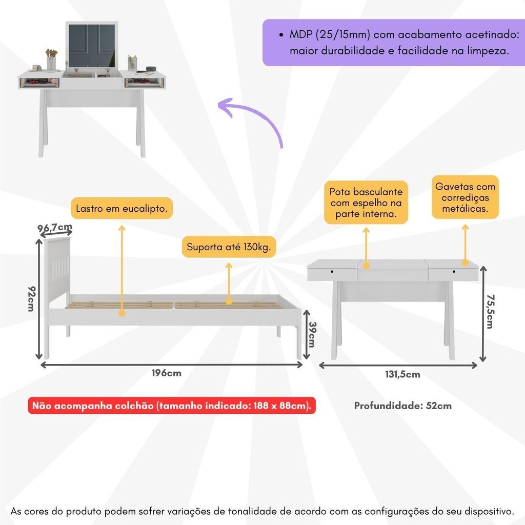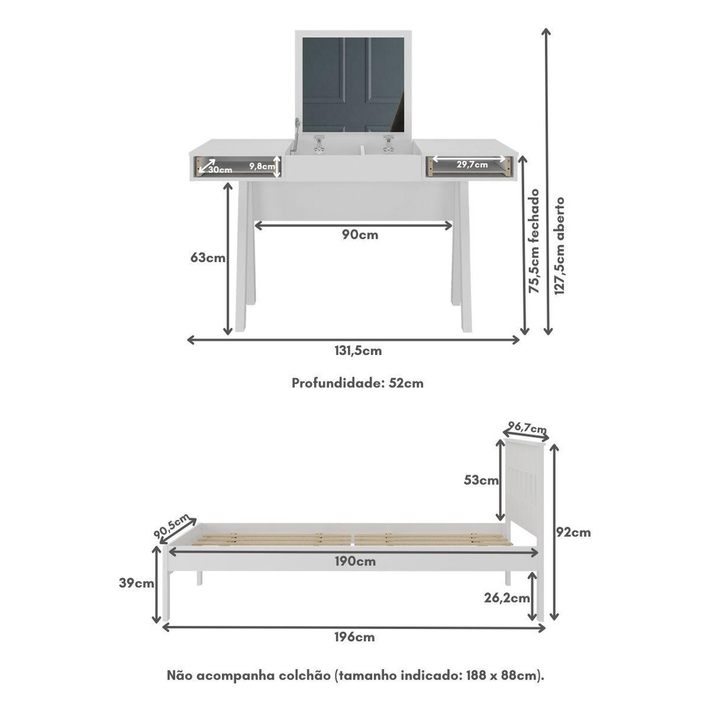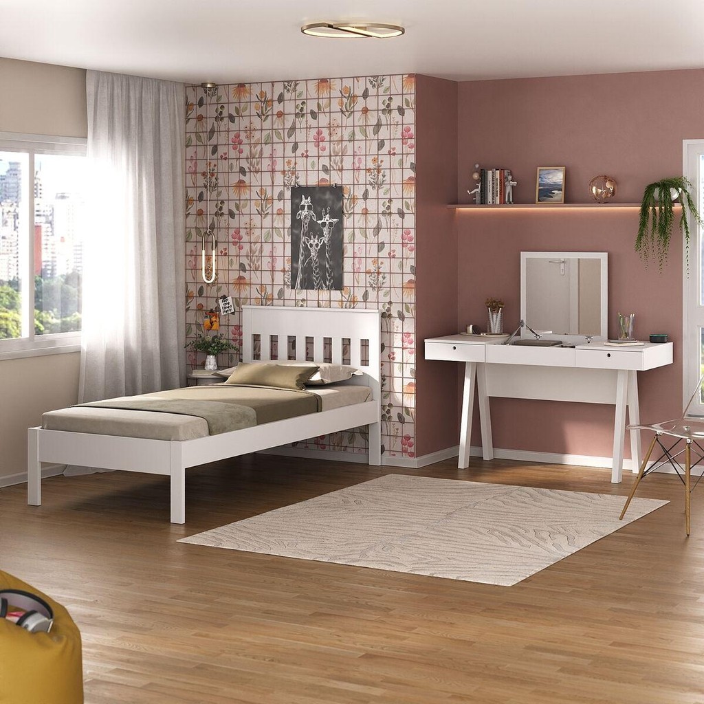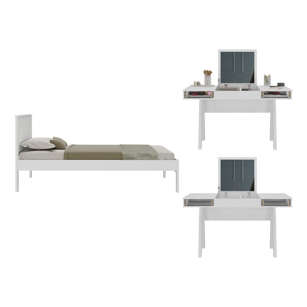 Cama de Solteiro para Colchão 88 x 188 cm com Penteadeira 131,5cm Multimóveis CR35247
