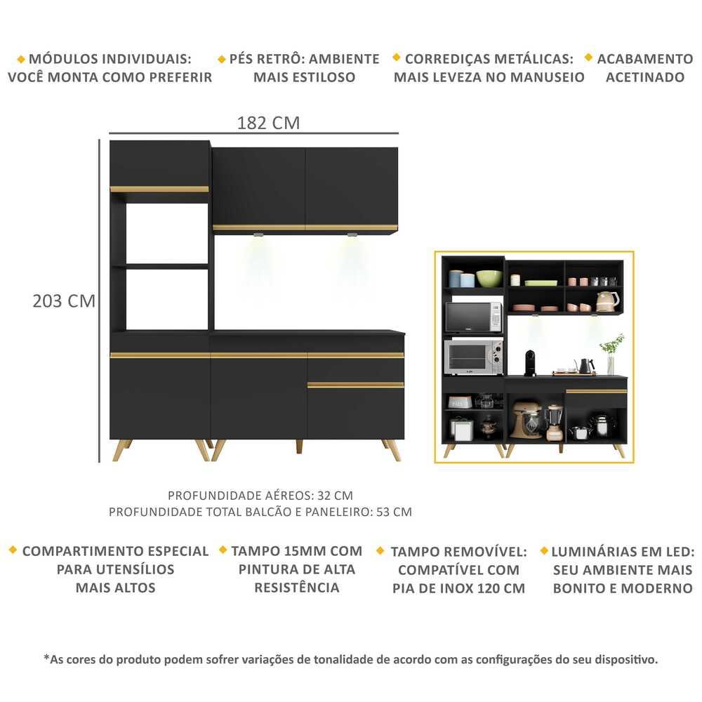 Cozinha Compacta 3 peças com Leds MP2019 Veneza Up Multimóveis Preta