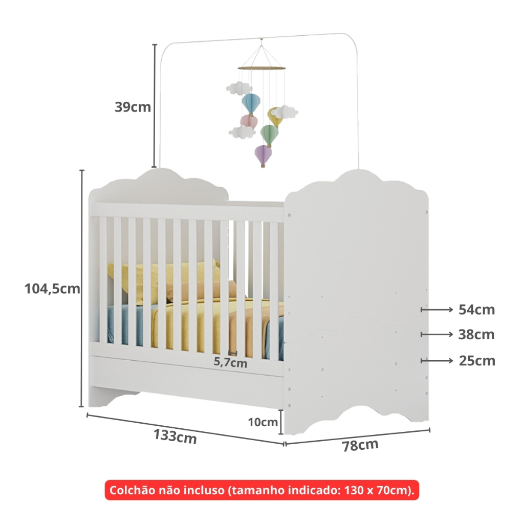 Berço Americano 3 em 1 para Colchão 70 x 130 cm com Grade Soft Nuvem Multimóveis Branco