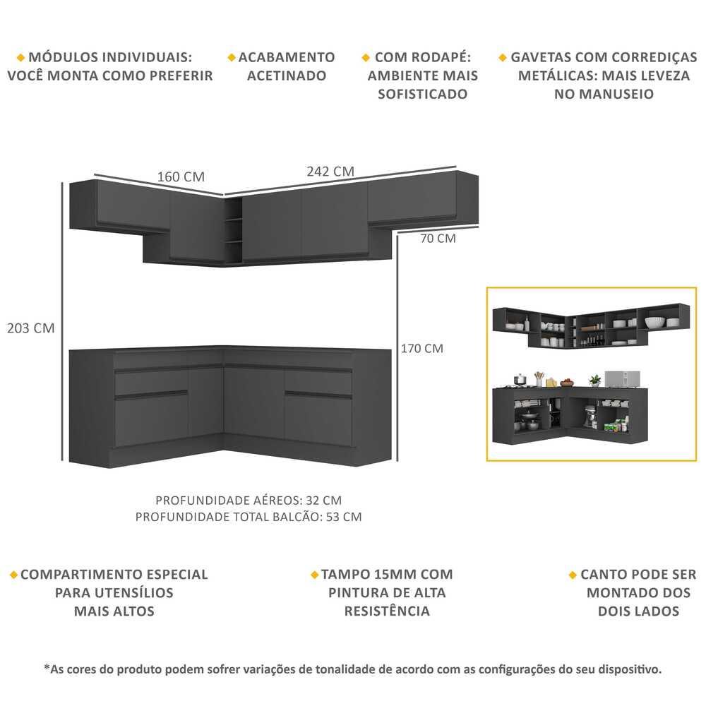 Armário de Cozinha Completa de Canto com Rodapé Veneza Multimóveis MP2104.895 Preto