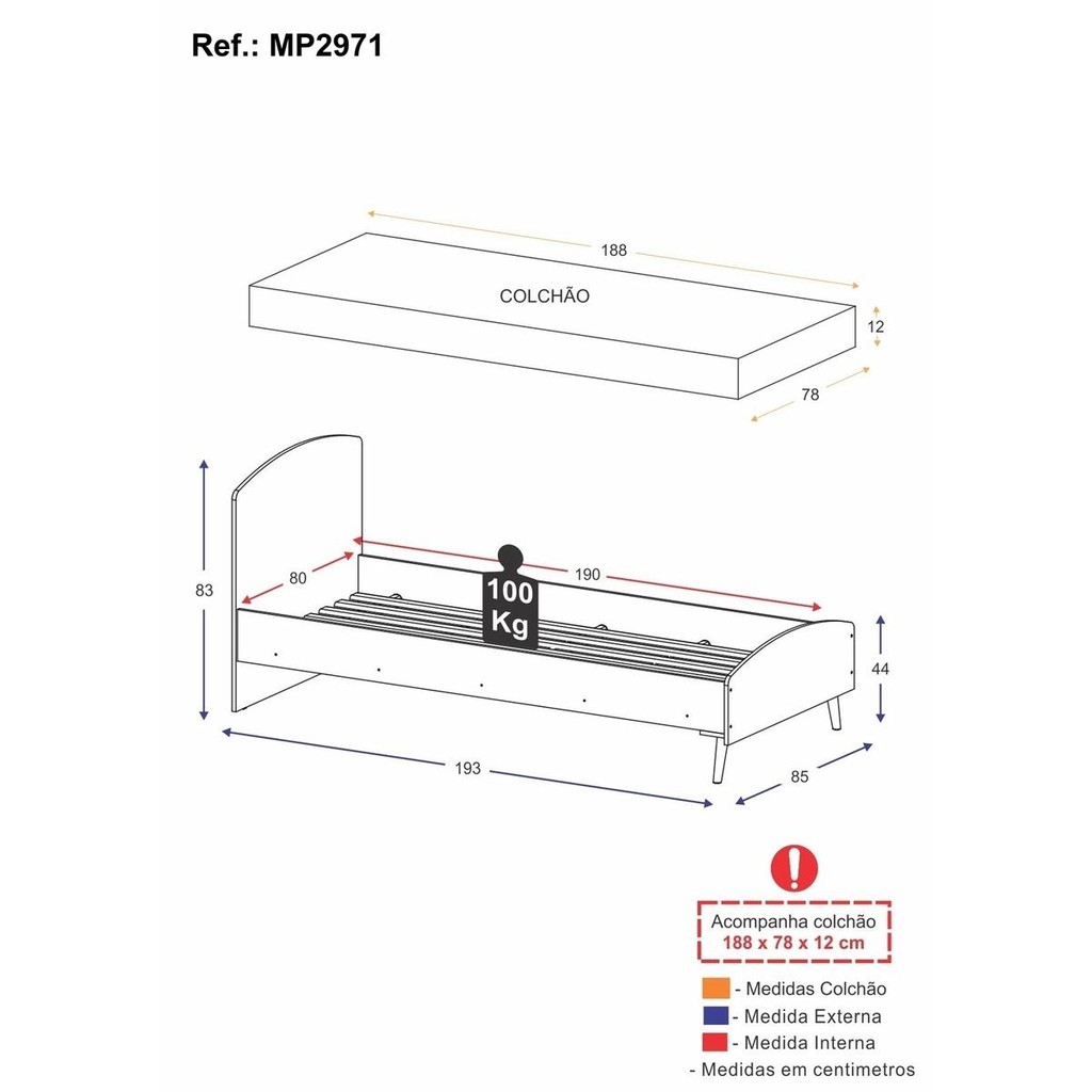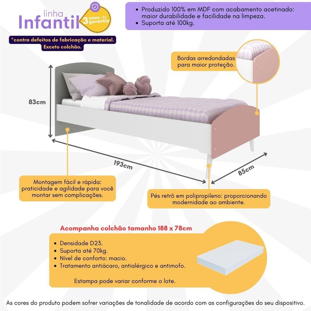 Cama Solteiro com Colchão Incluso 78x188cm 100% MDF Doçura Multimóveis Branca/Cinza/Rosa