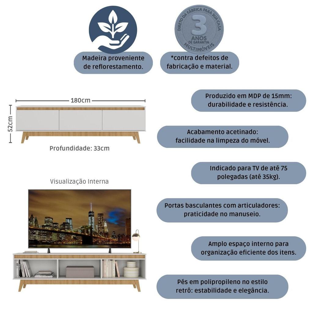 Rack para TV até 75 Polegadas 180cm 3 Portas Retrô Multimóveis MP1102