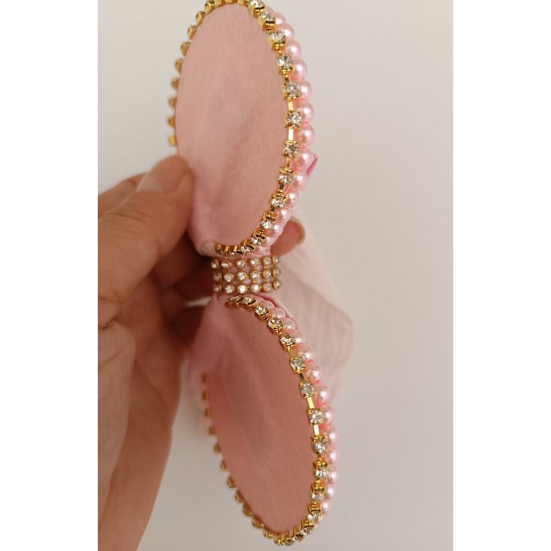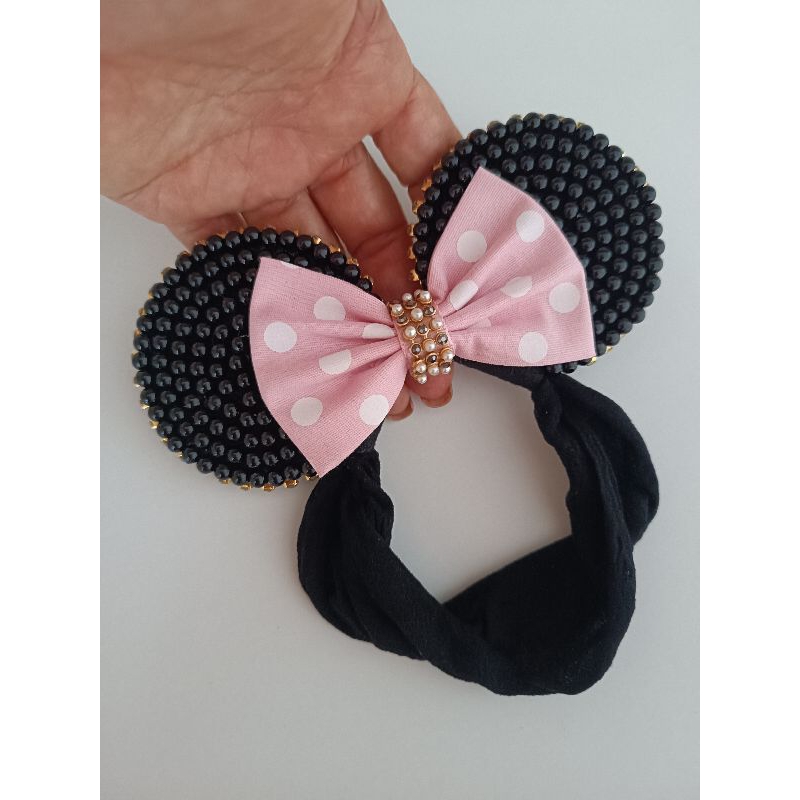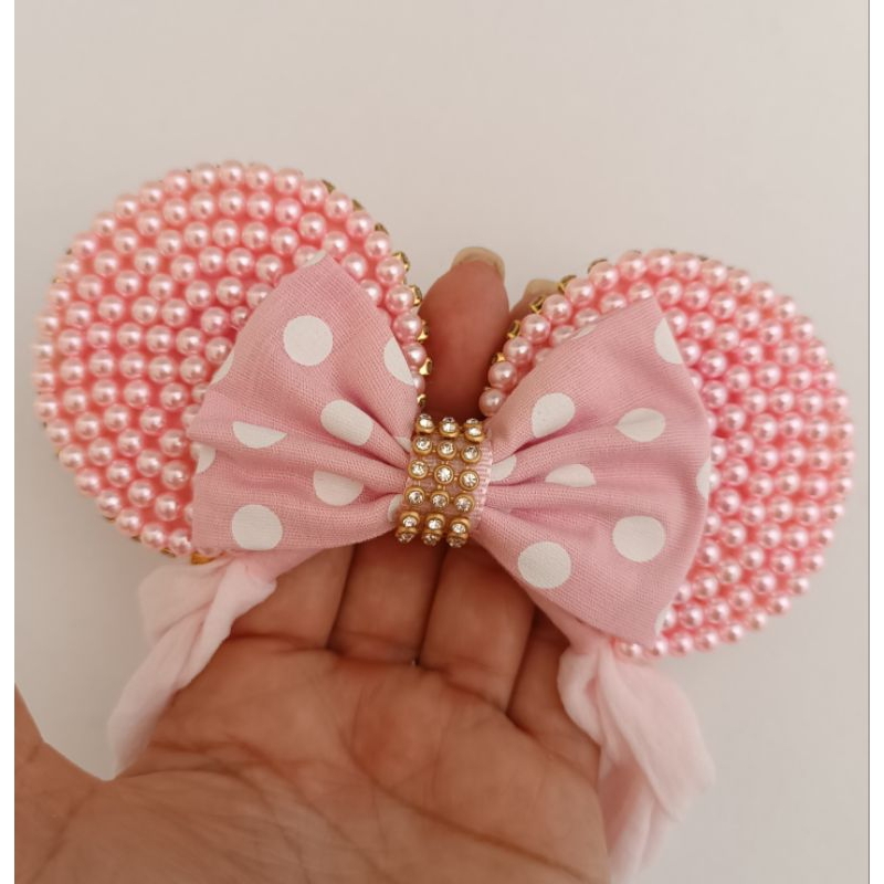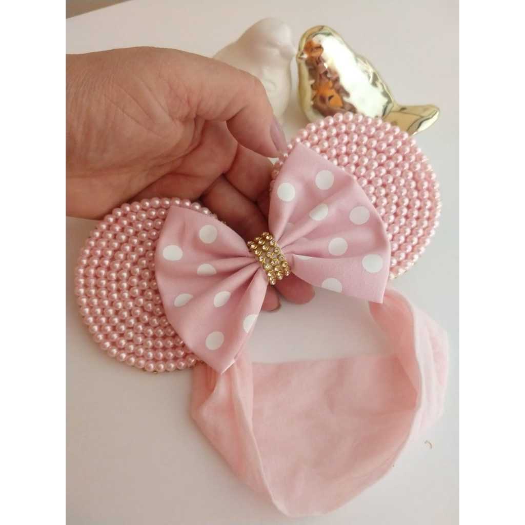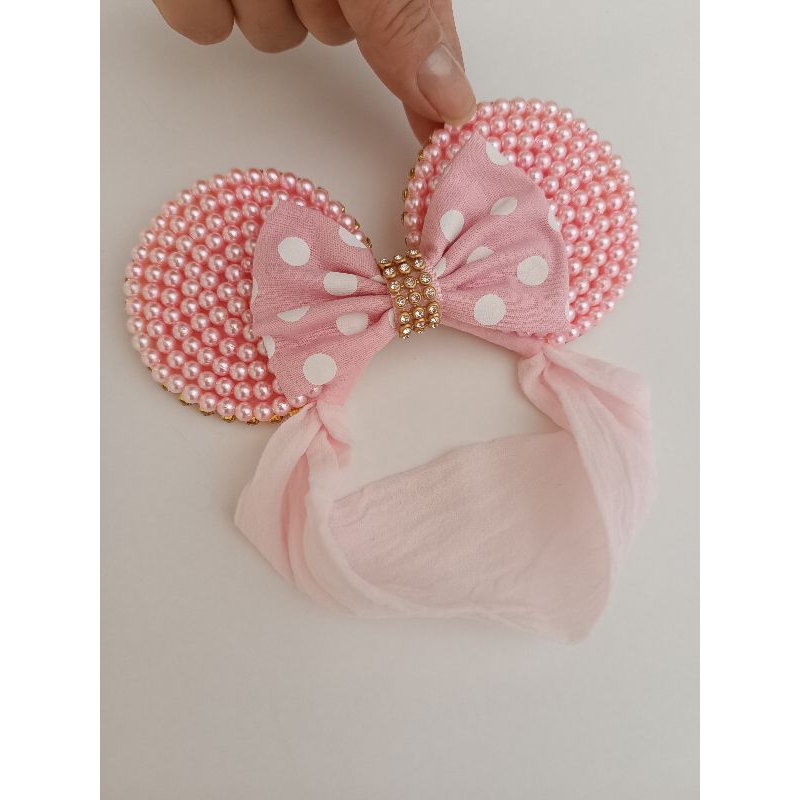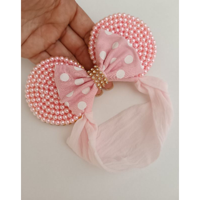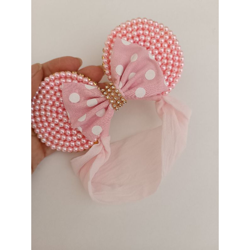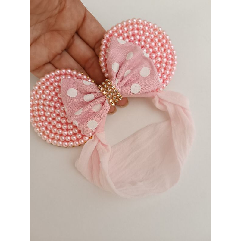 Tiara Minie em pérolas cor de rosa na faixa meia de seda bebe