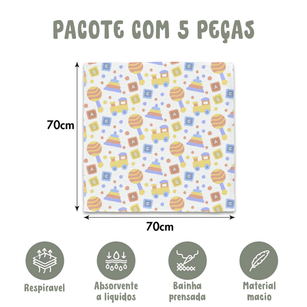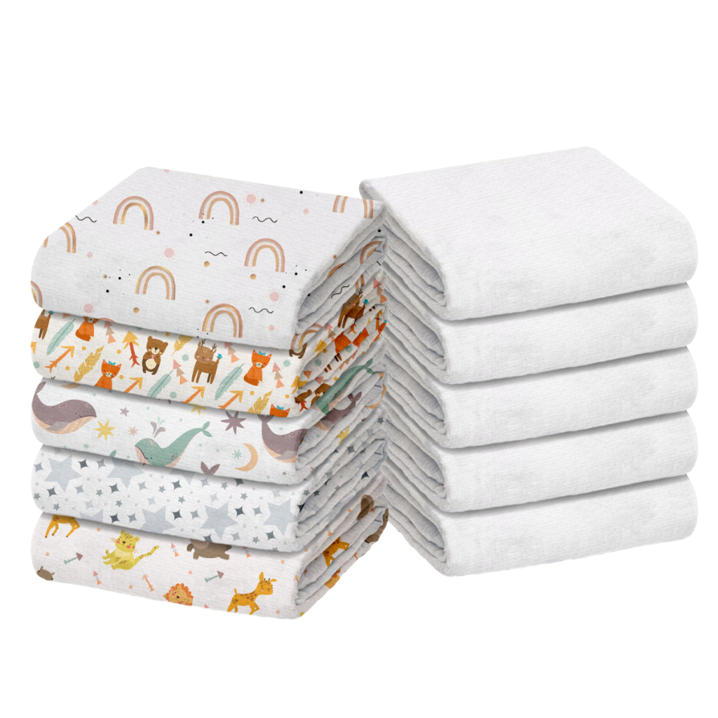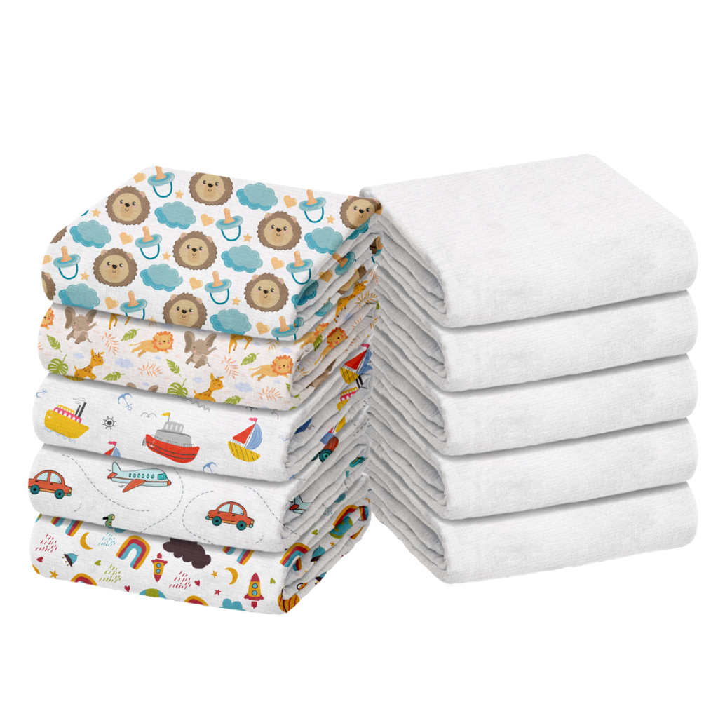 Pacote com 10 Fraldas de Pano (5 Luxo Lisa Branca + 5 Estampadas) Marca Minasrey p/ Bebês e Recém-Nascidos 70cm x 70cm