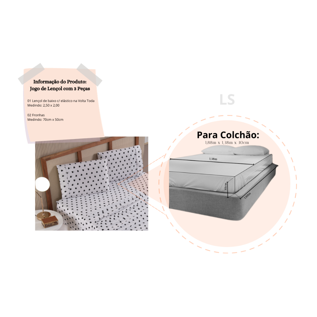 Jogo de Lençol Casal Padrão 3 Peças Coração 100% Algodão Percal