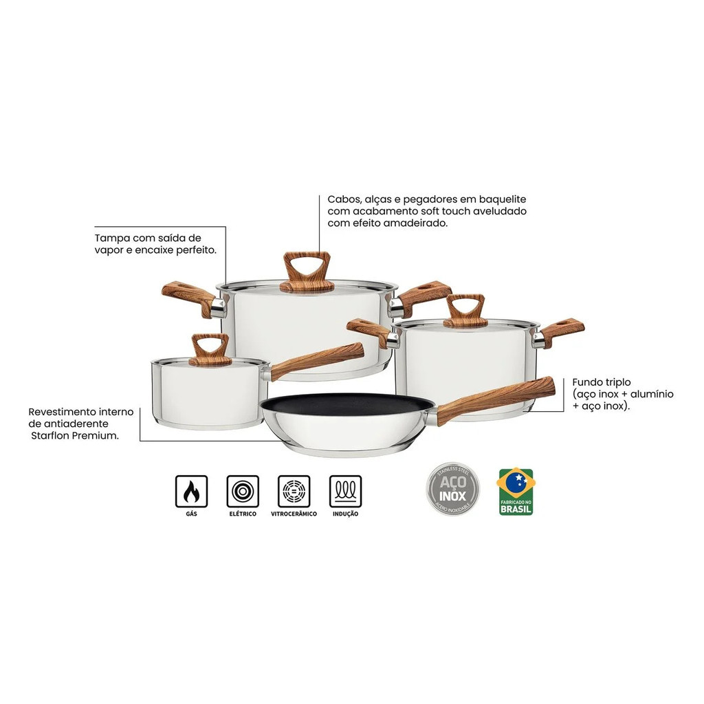 Jogo De Panelas Indução Aço Inox 4 Peças Brava Antiaderente