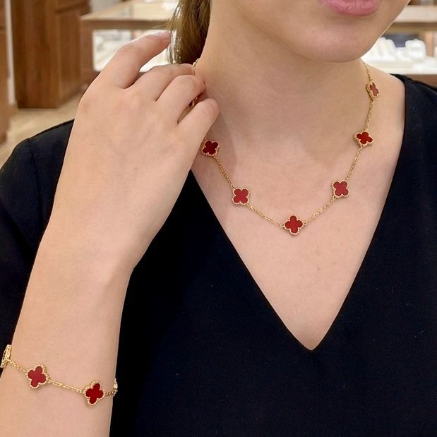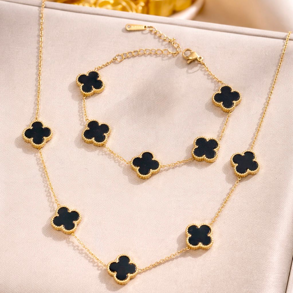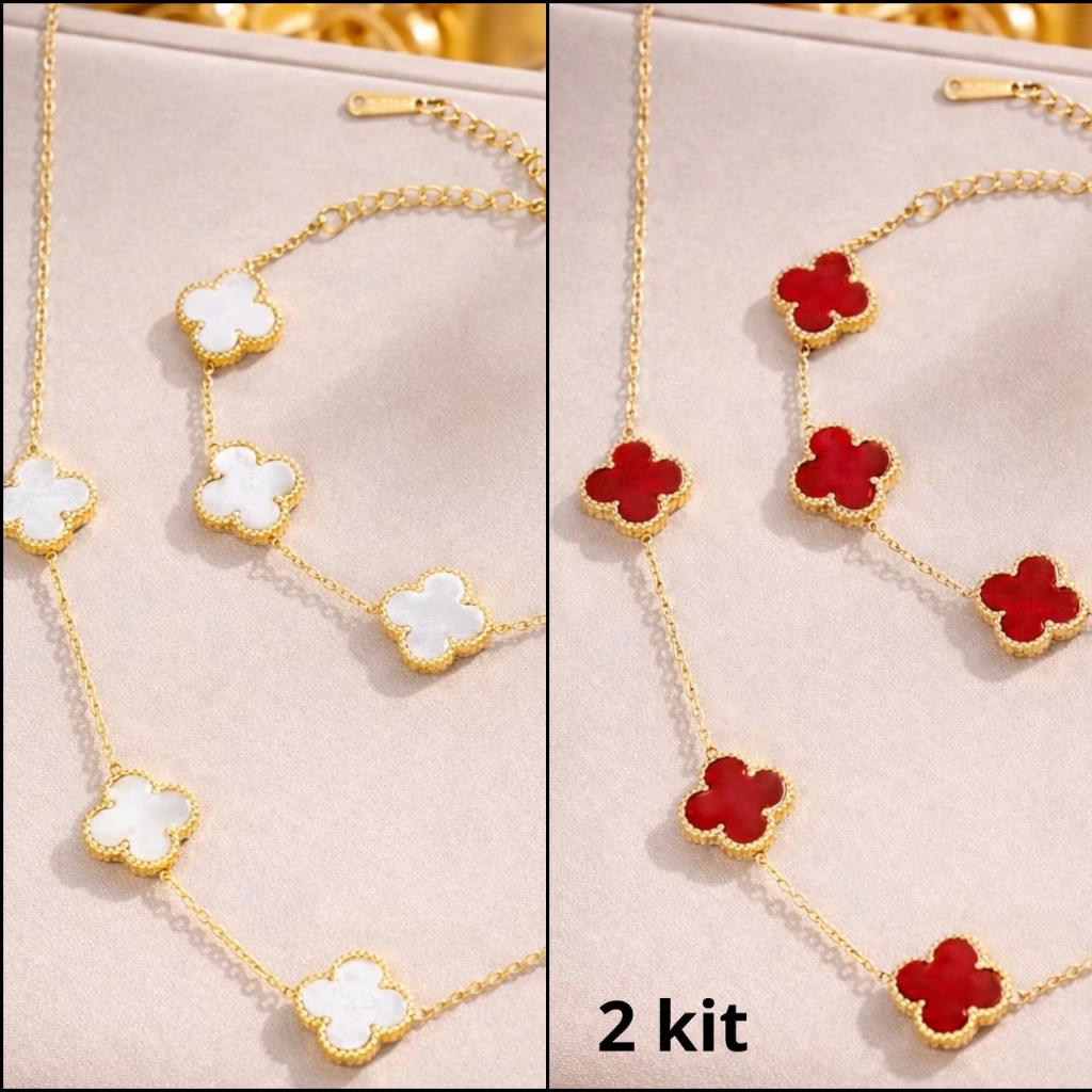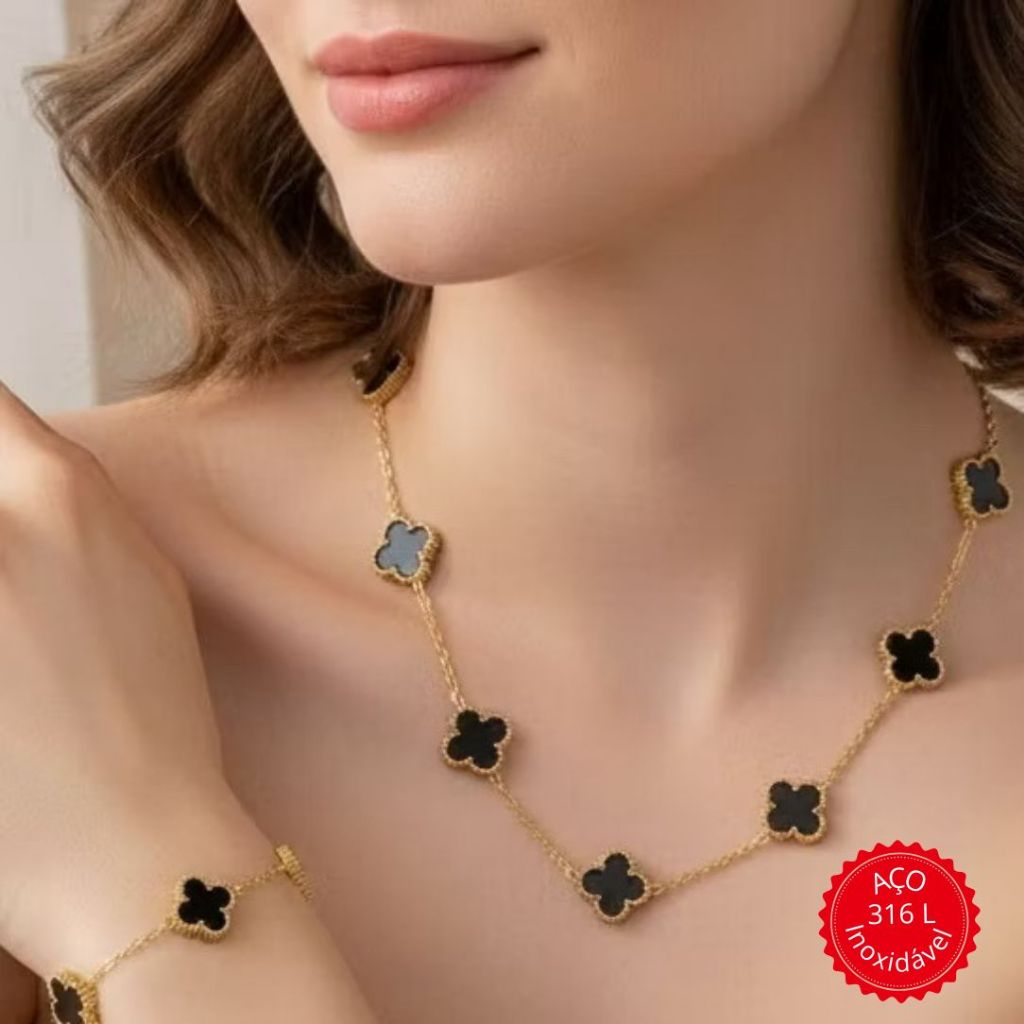 Conjunto Colar e Pulseira Trevo em Aço Inoxidável Dourado | Preto, Vermelho, Branco e Verde