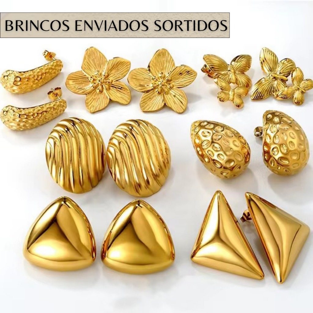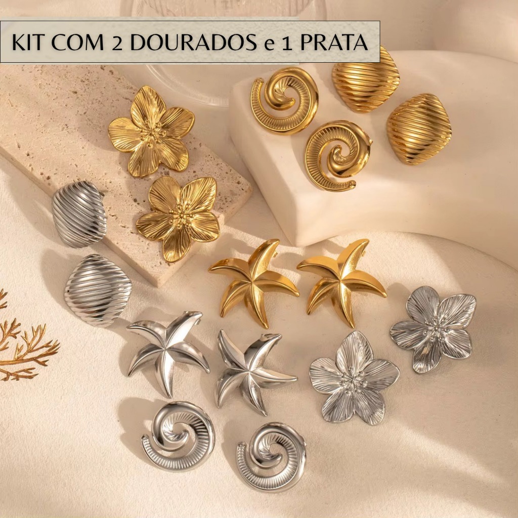 Kit 3 Brincos em Aço Inoxidável 2 Brincos Dourado 1 Prata, Antialérgico, Não Escurece, Leve