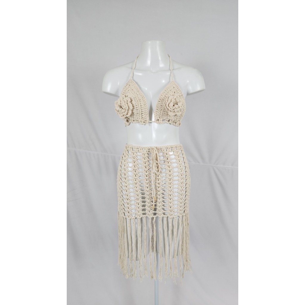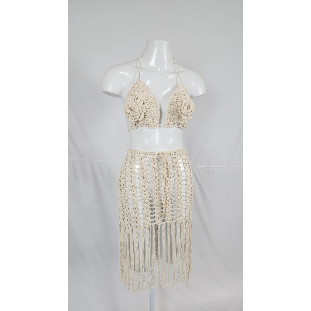 Conjunto Top e Saia De Crochê Feminino Saída de Praia Moda Artesanal Ajustável Confortável C723