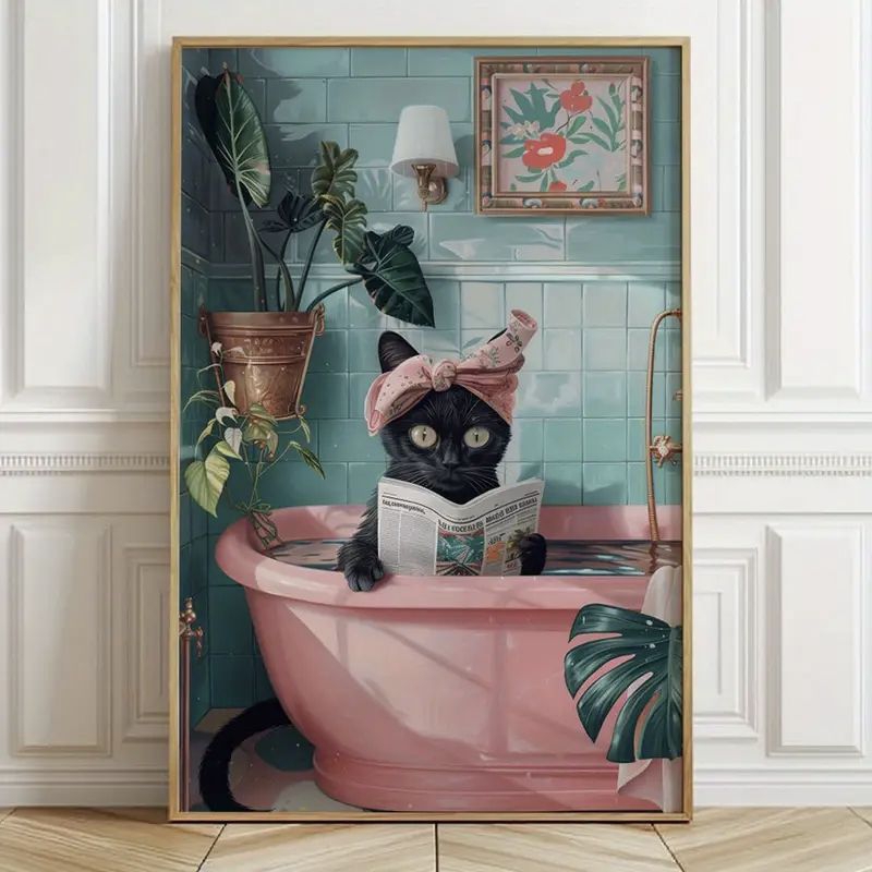 Quadro Decorativo gatinho na banheira rosa banheiro