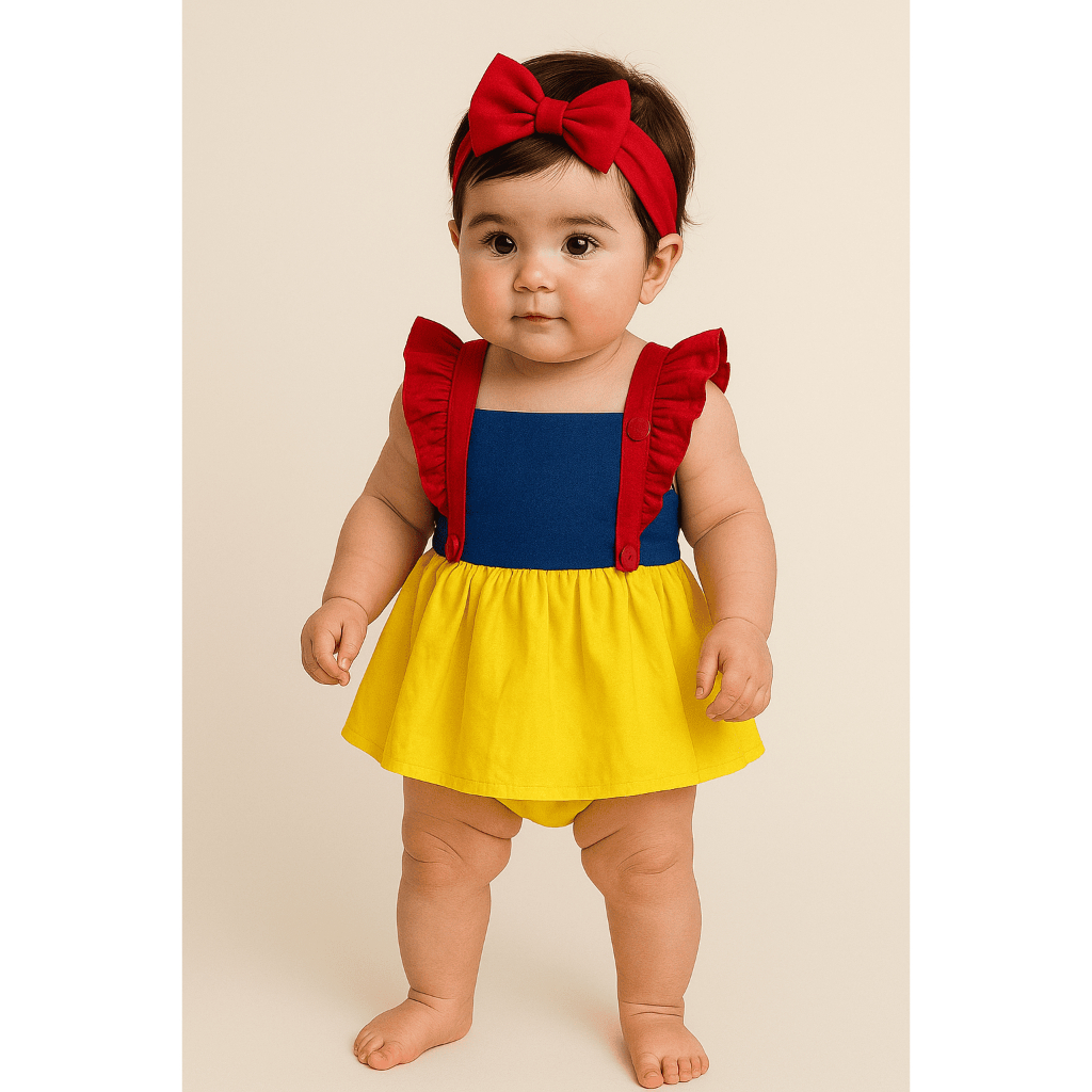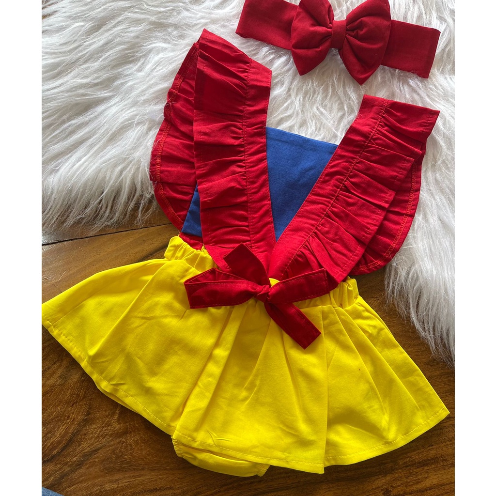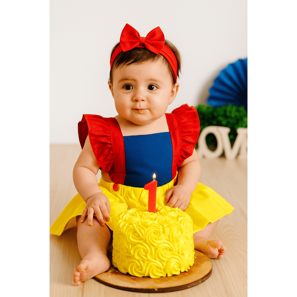 Jardineira Saia Body Romper Menina Bebê Branca De Neve Mesversario Amarelo Smash The Cake Ensaio