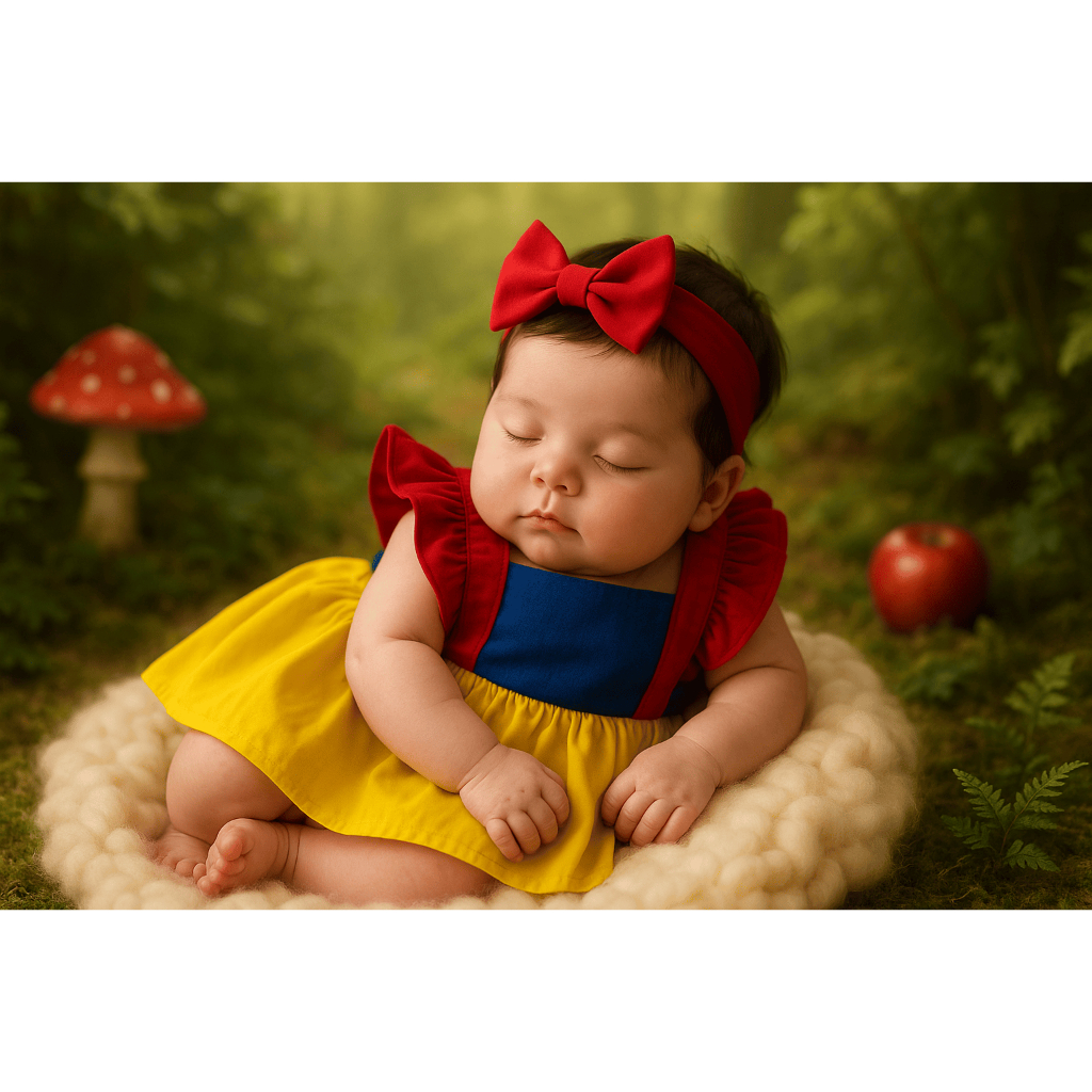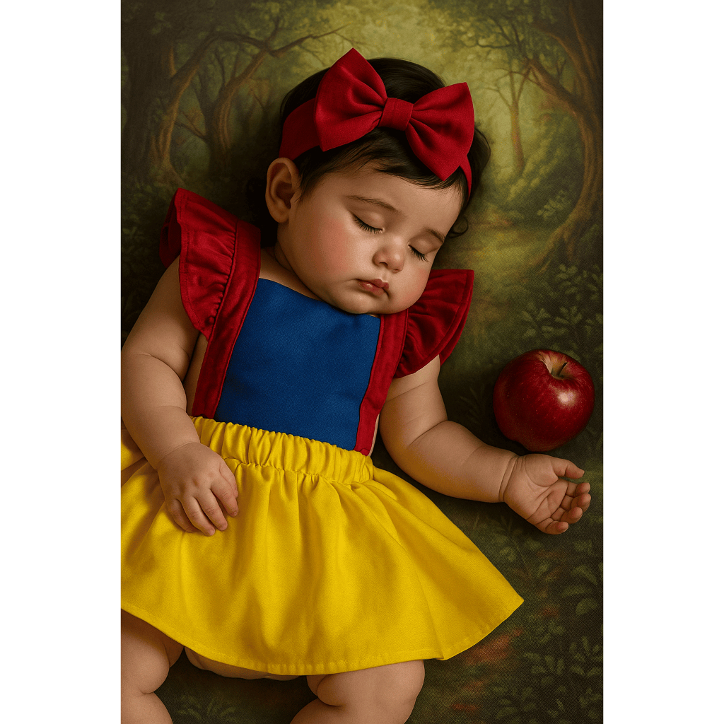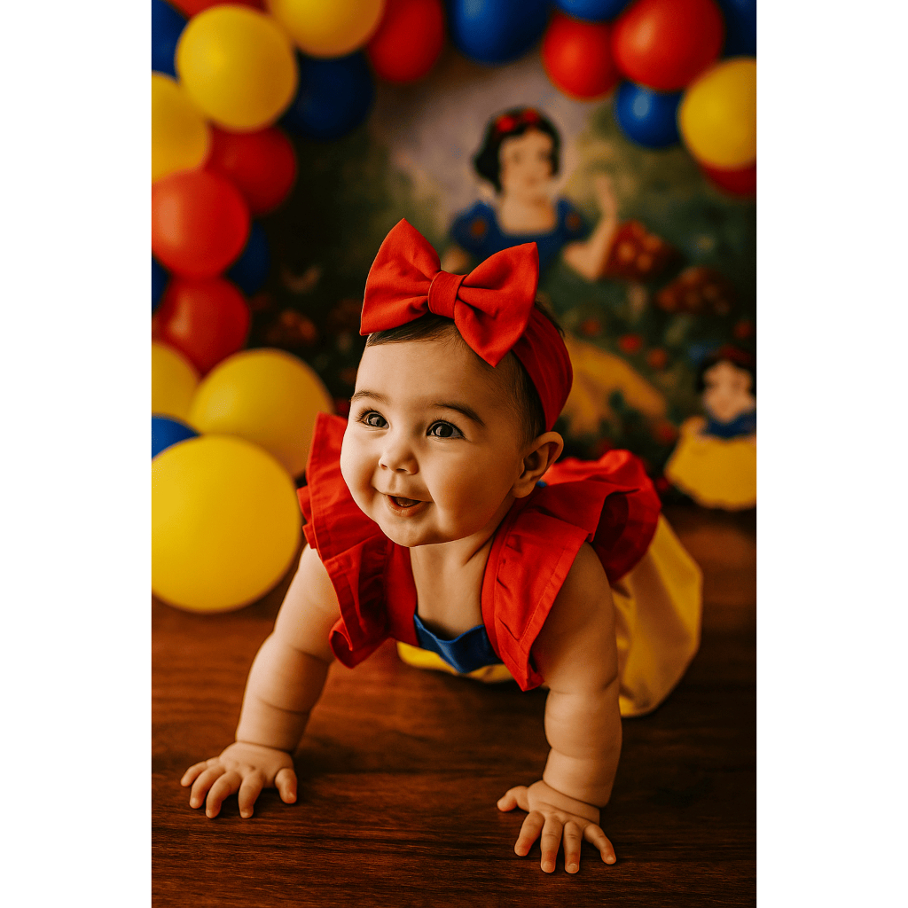 Jardineira Saia Body Romper Menina Bebê Branca De Neve Mesversario Amarelo Smash The Cake Ensaio