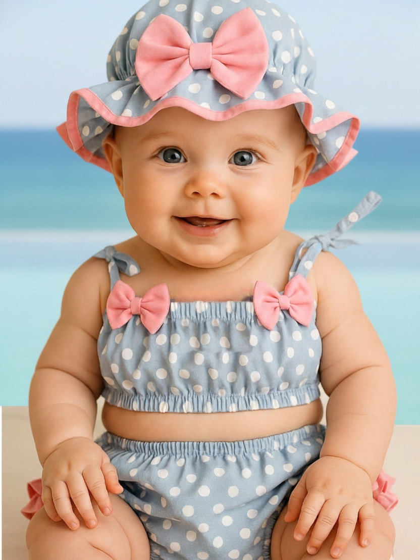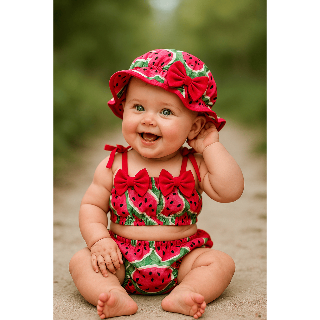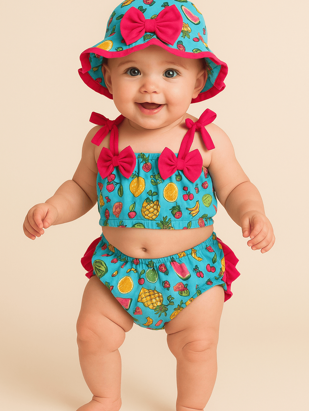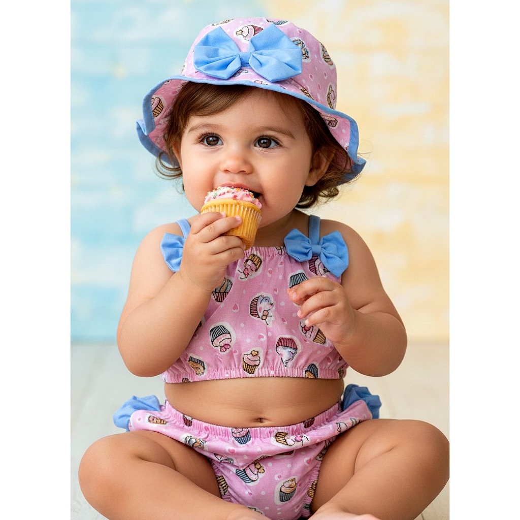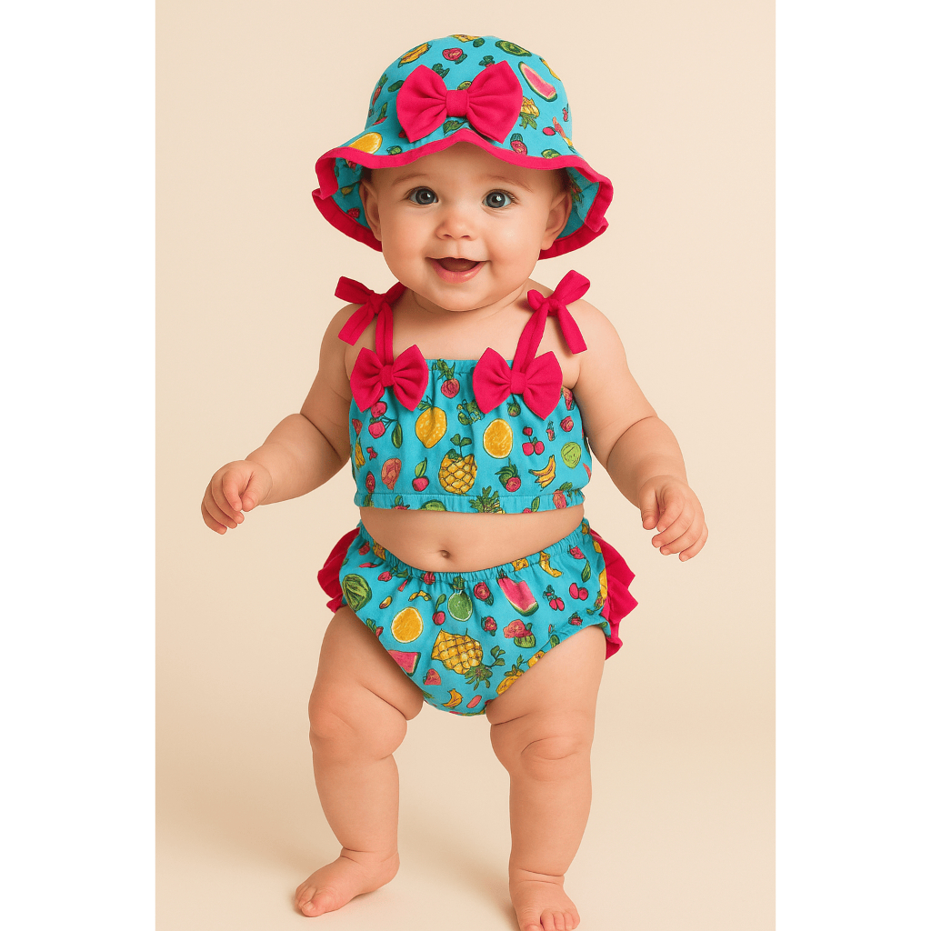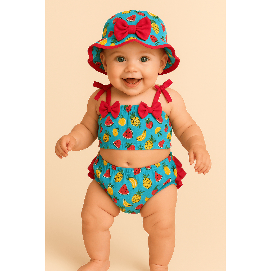 Banho De Sol Conjunto Infantil Top + Calcinha + Chapeu Baby Várias Estampas Verão Menina Bebê Praia