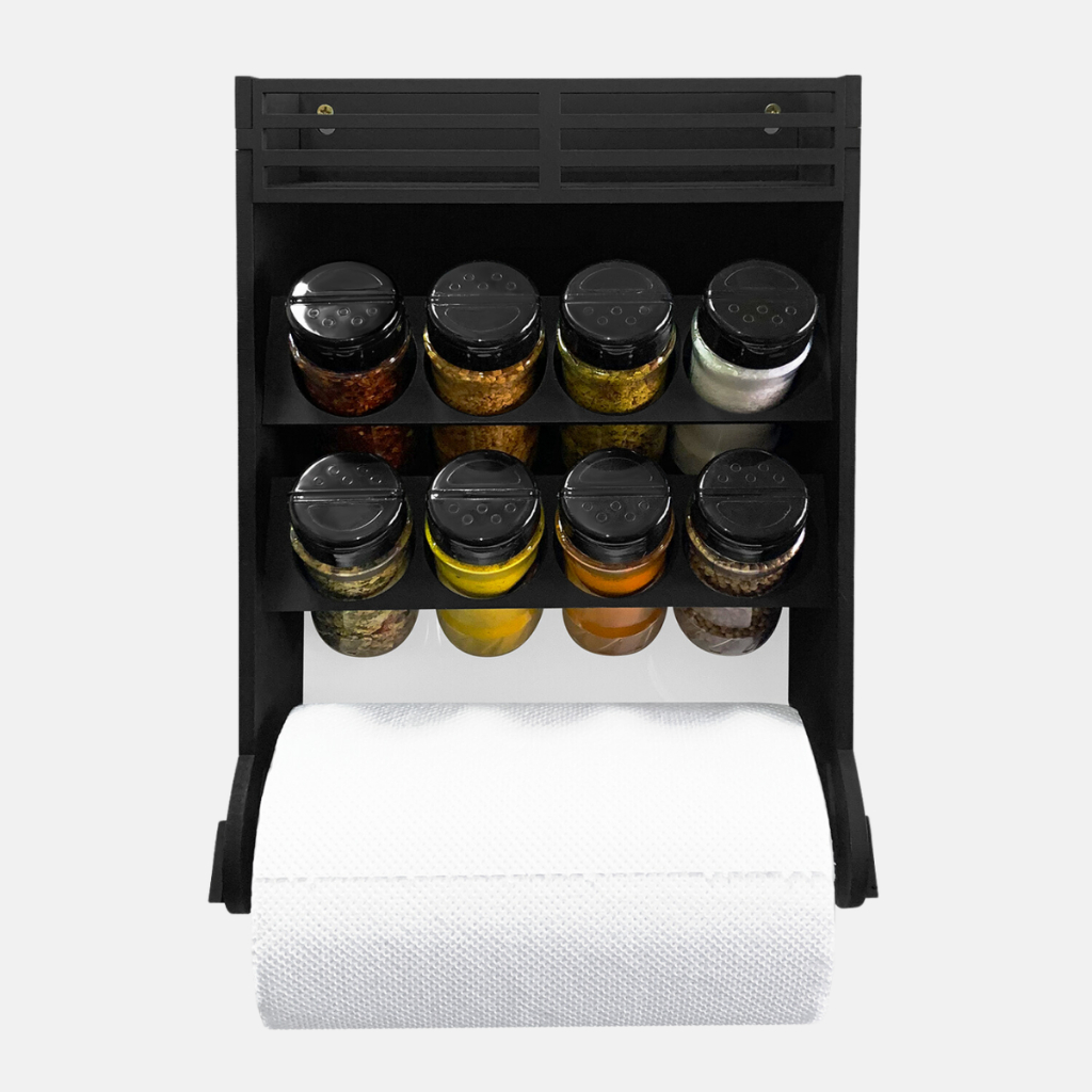Porta Papel Toalha Condimento Parede MDF Resistente com 8 Potes Plástico 130ml Tampa Dosadora Dupla