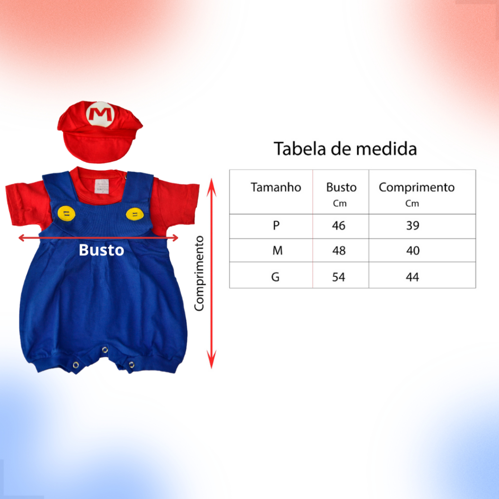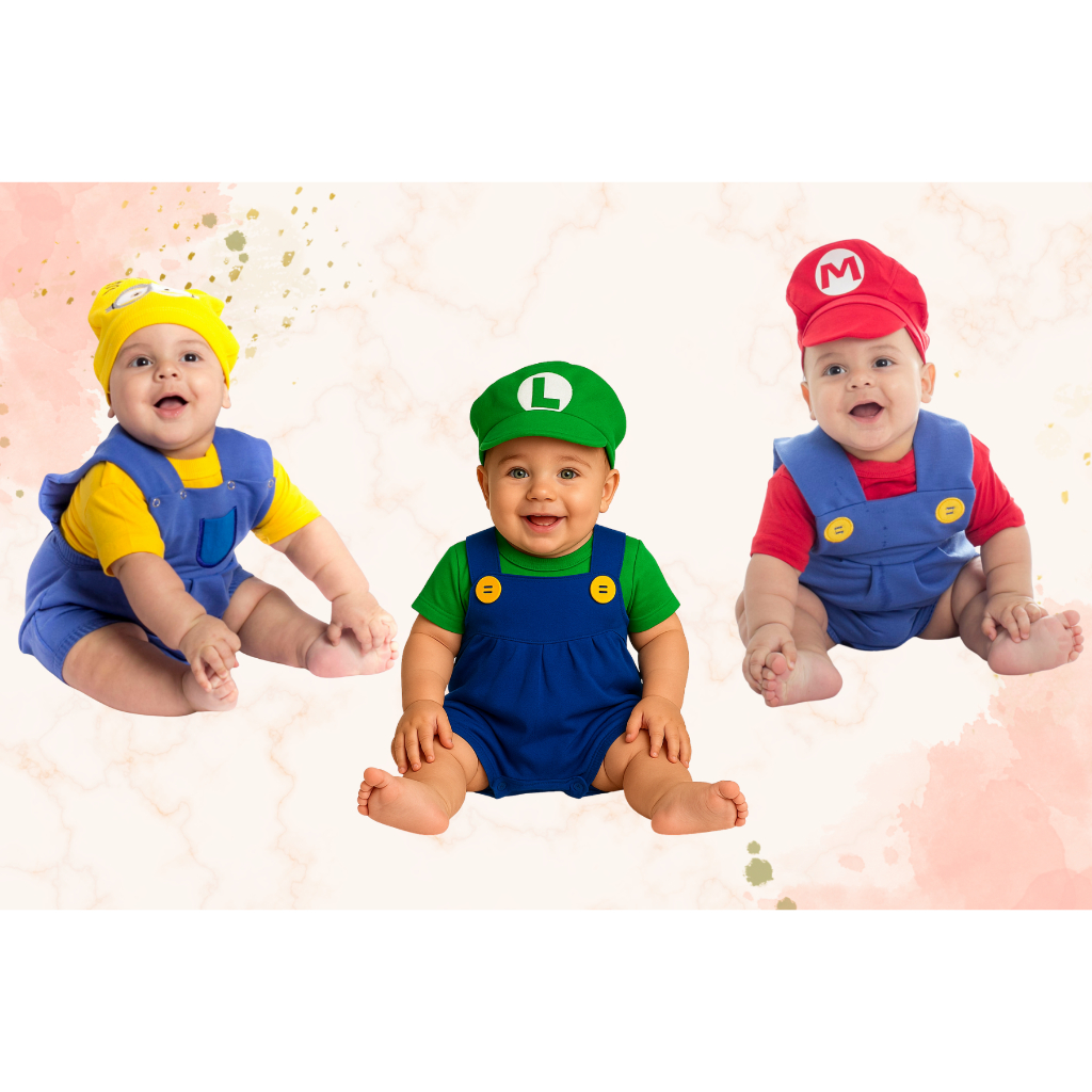Conjunto Super Mario Bros - Bebês - Macacão + Blusa + Boina