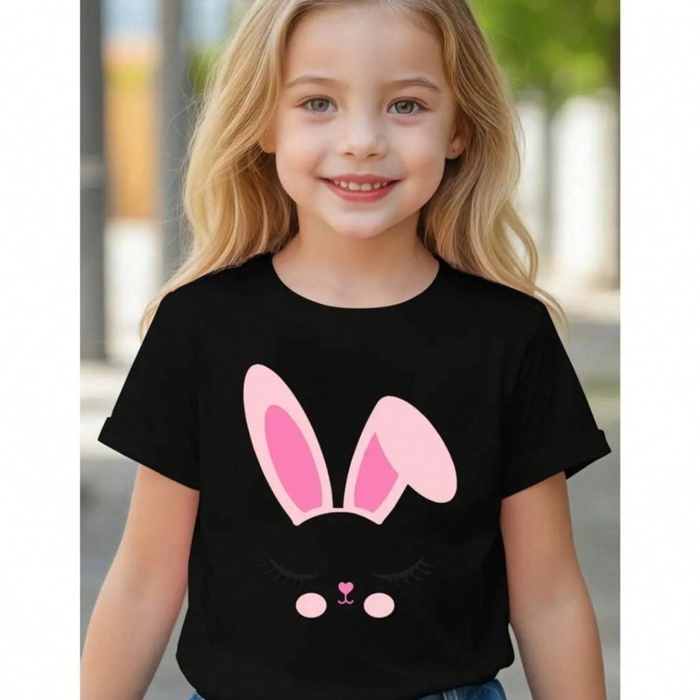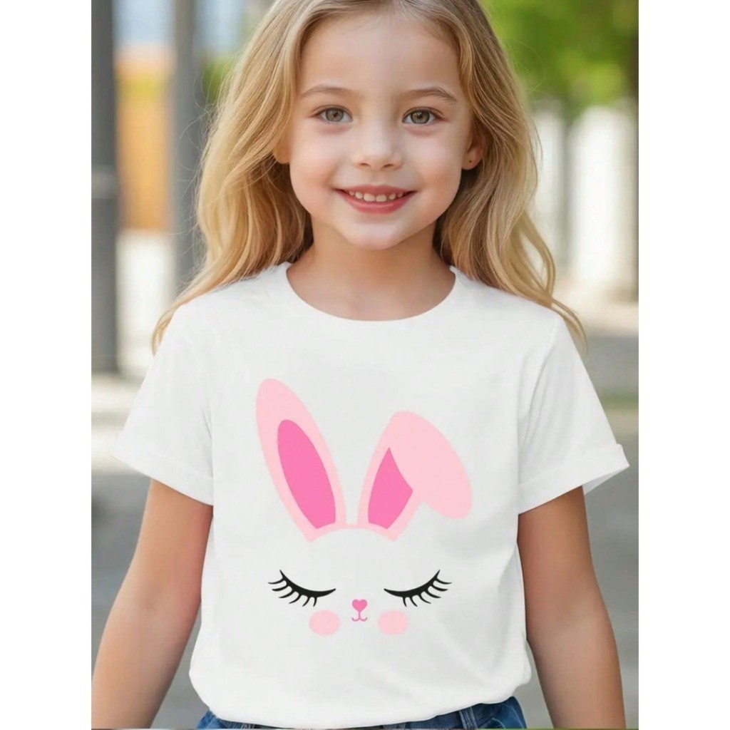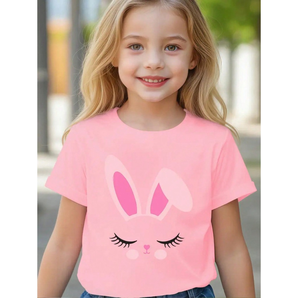 Camiseta Infantil De Manga Curta Casual Colorida Adequada Para Meninas Algodão Estampa De Coelho