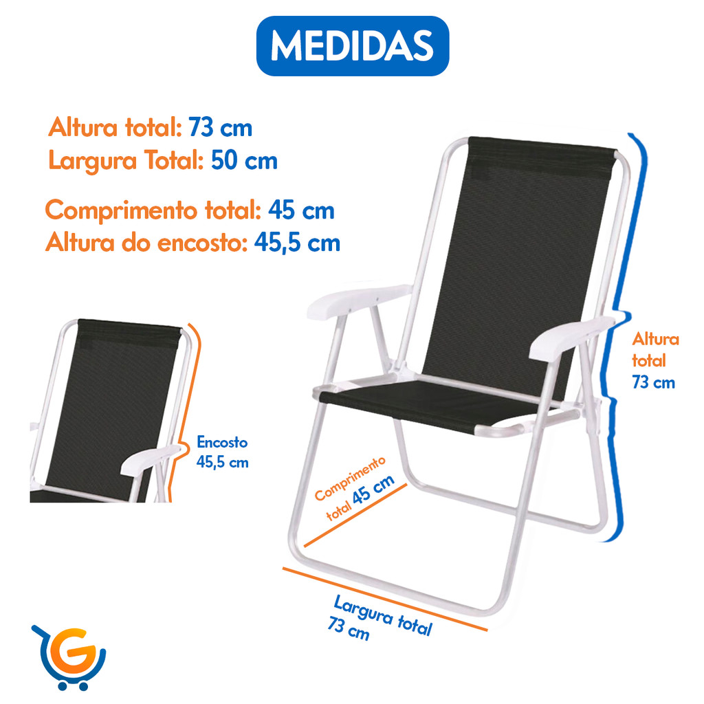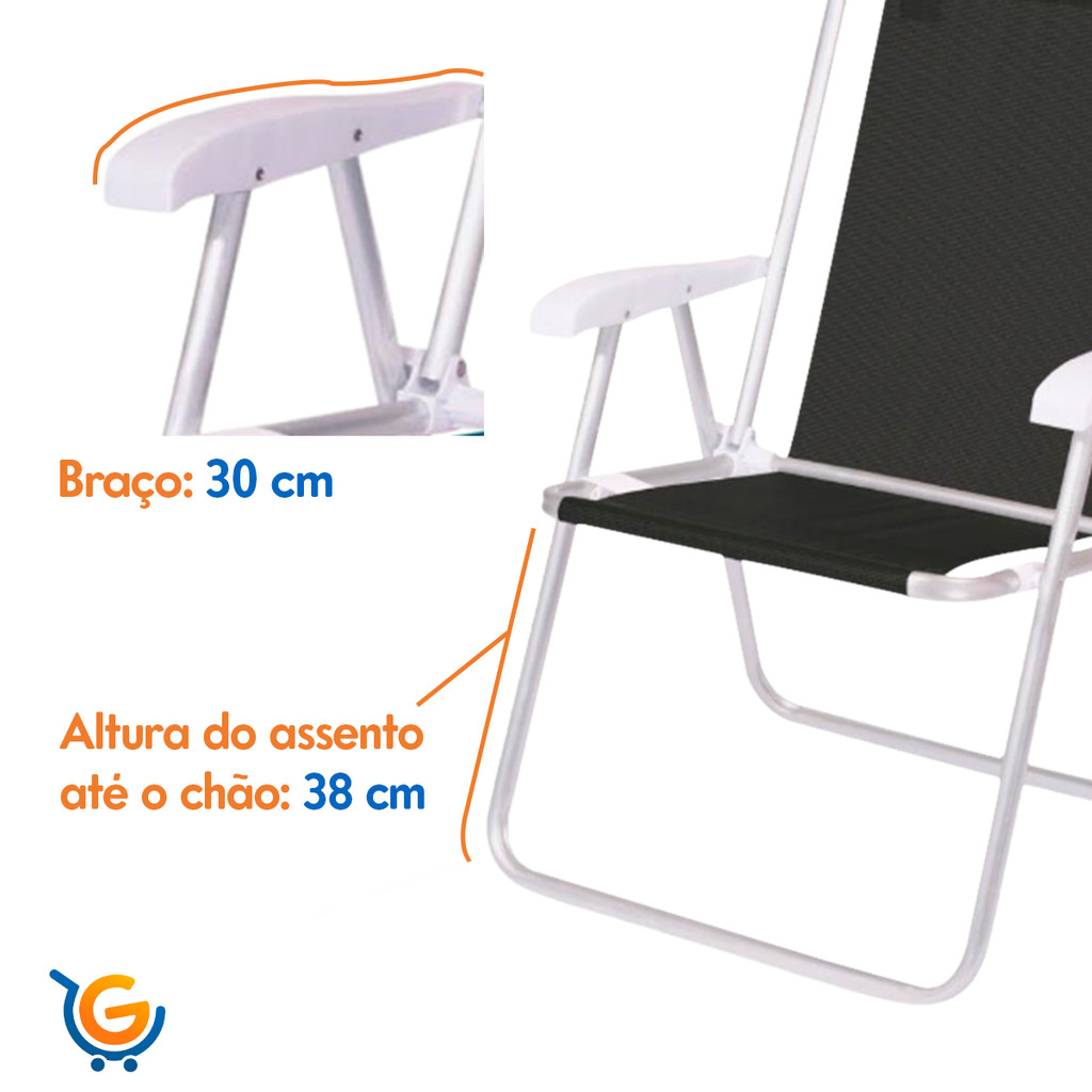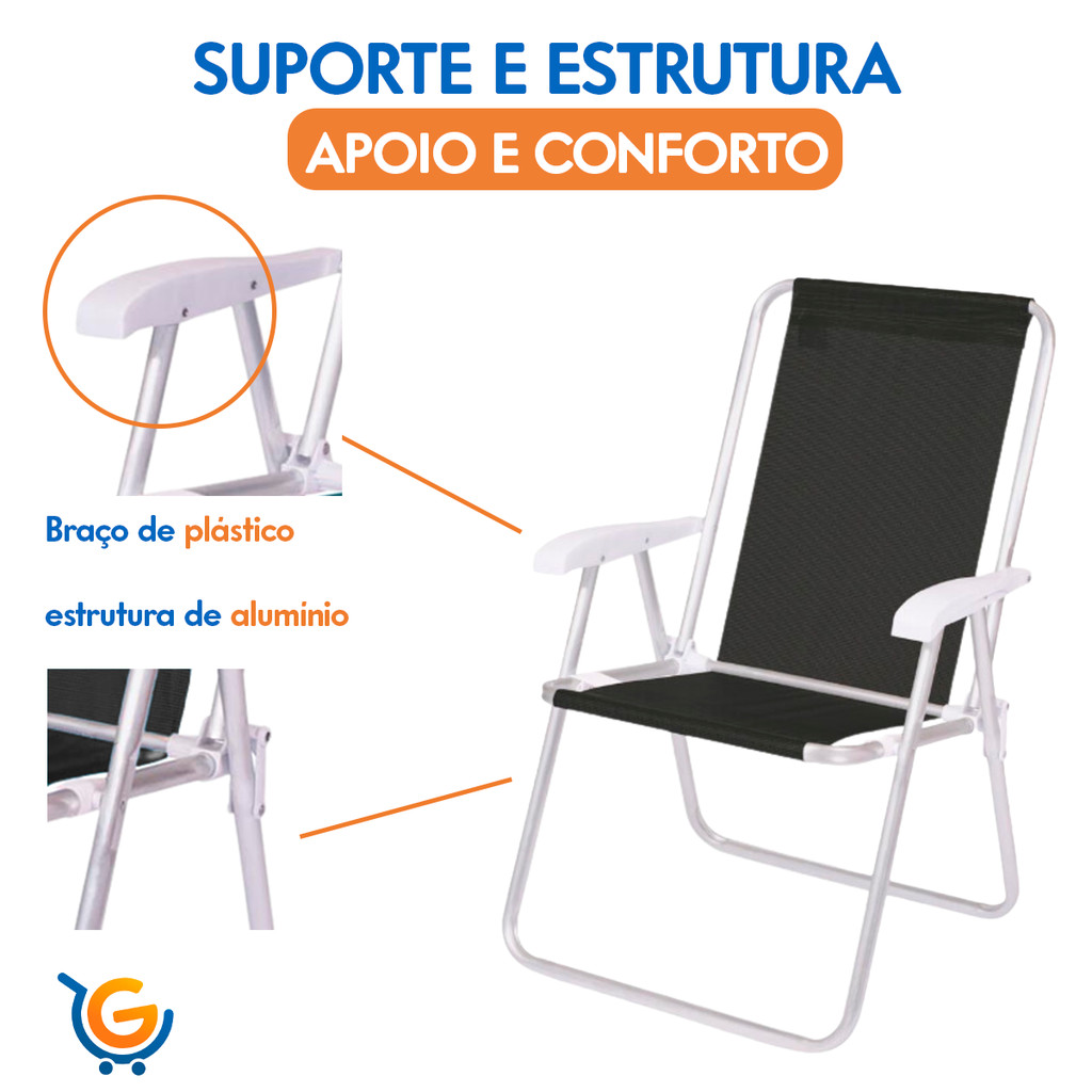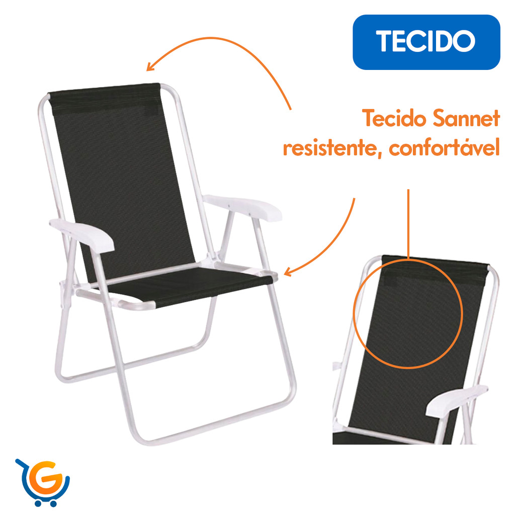 Kit 2 Cadeira Praia Conforto Braço de Plástico Alta Alumínio Preta Tela Sannet Portátil Dobrável Mor