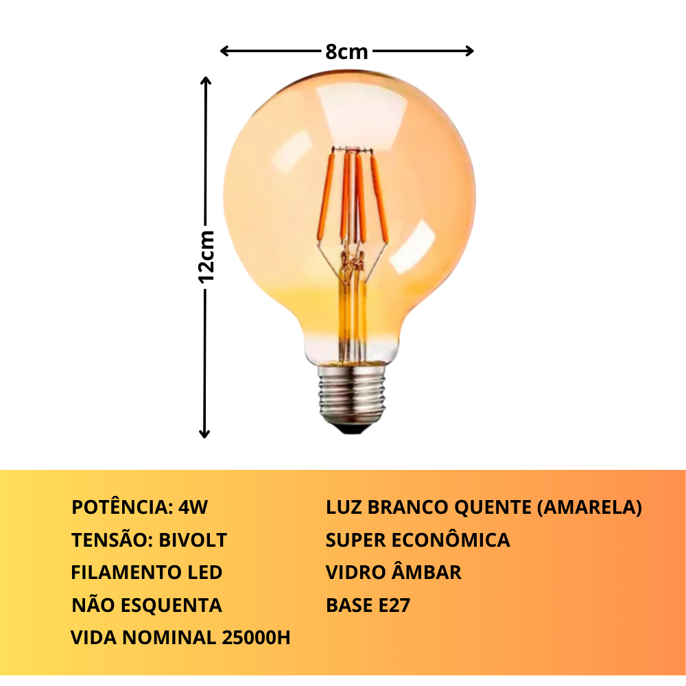 Kit 7x Lâmpada Filamento LED Retrô Vintage Âmbar G80 4W Bivolt