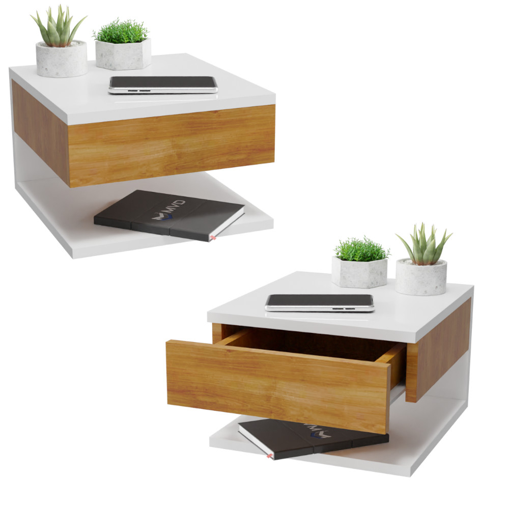 KIT 2 Mesa de Cabeceira Suspensa com Gaveta e Prateleira Branco Freijó Mesinha