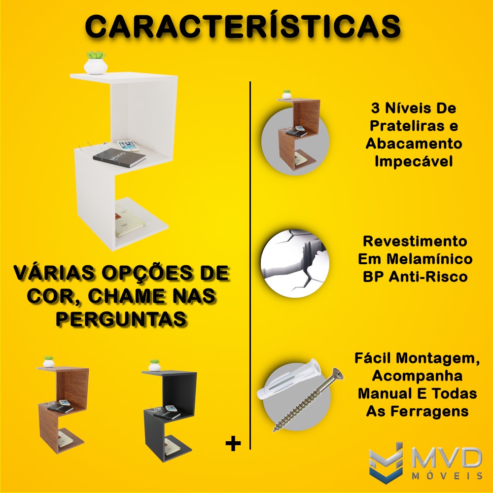 Mesa De Cabeceira Tipo S Branco Mesinha Lateral Canto Sala Quarto Várias Cores MVD Móveis