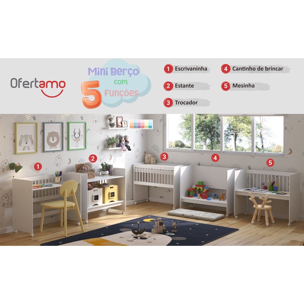 Mini Berço Moisés Multifuncional 100% MDF Com Colchão Branco Ofertamo