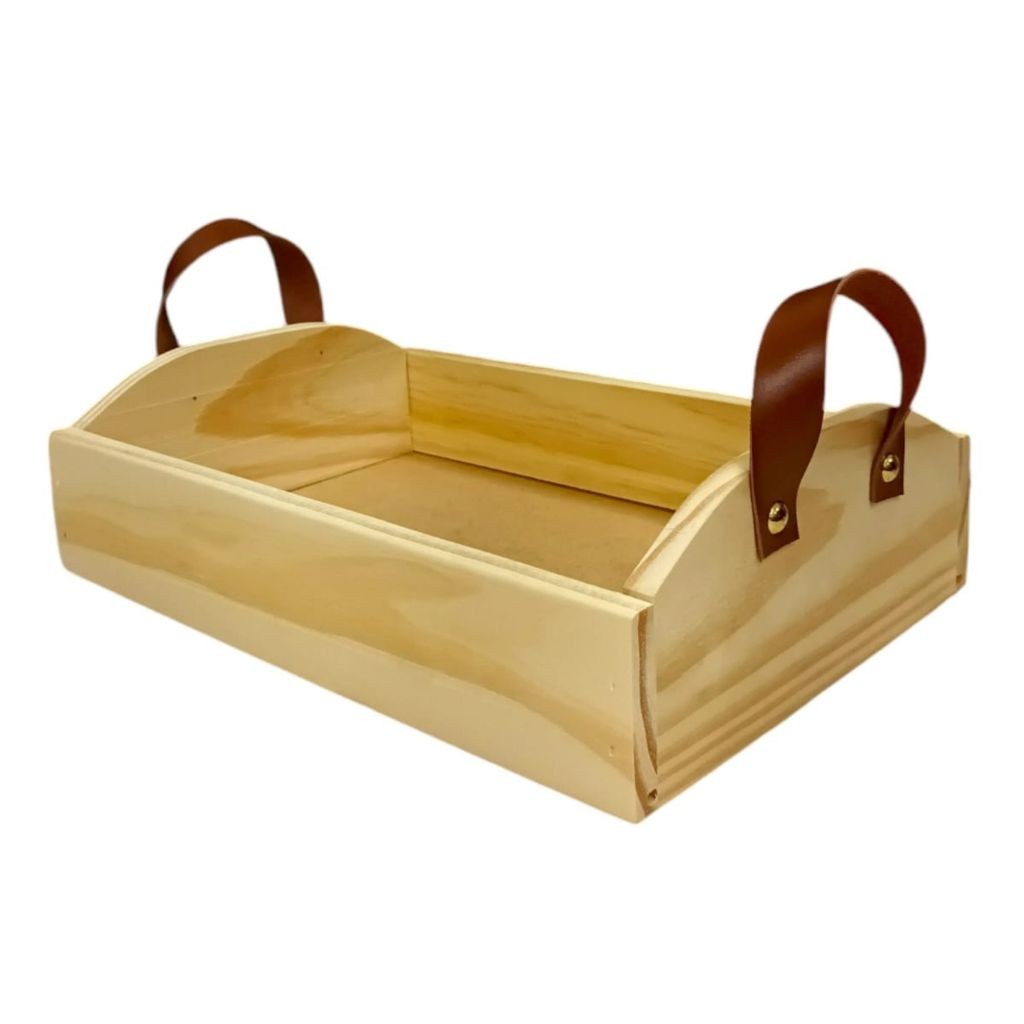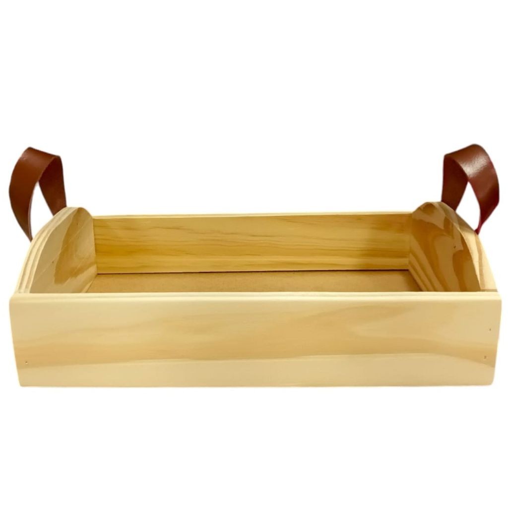 Bandeja Café da Manhã Madeira Pinus Cesta de Decoração Alça em Couro 20X30X8,5cm