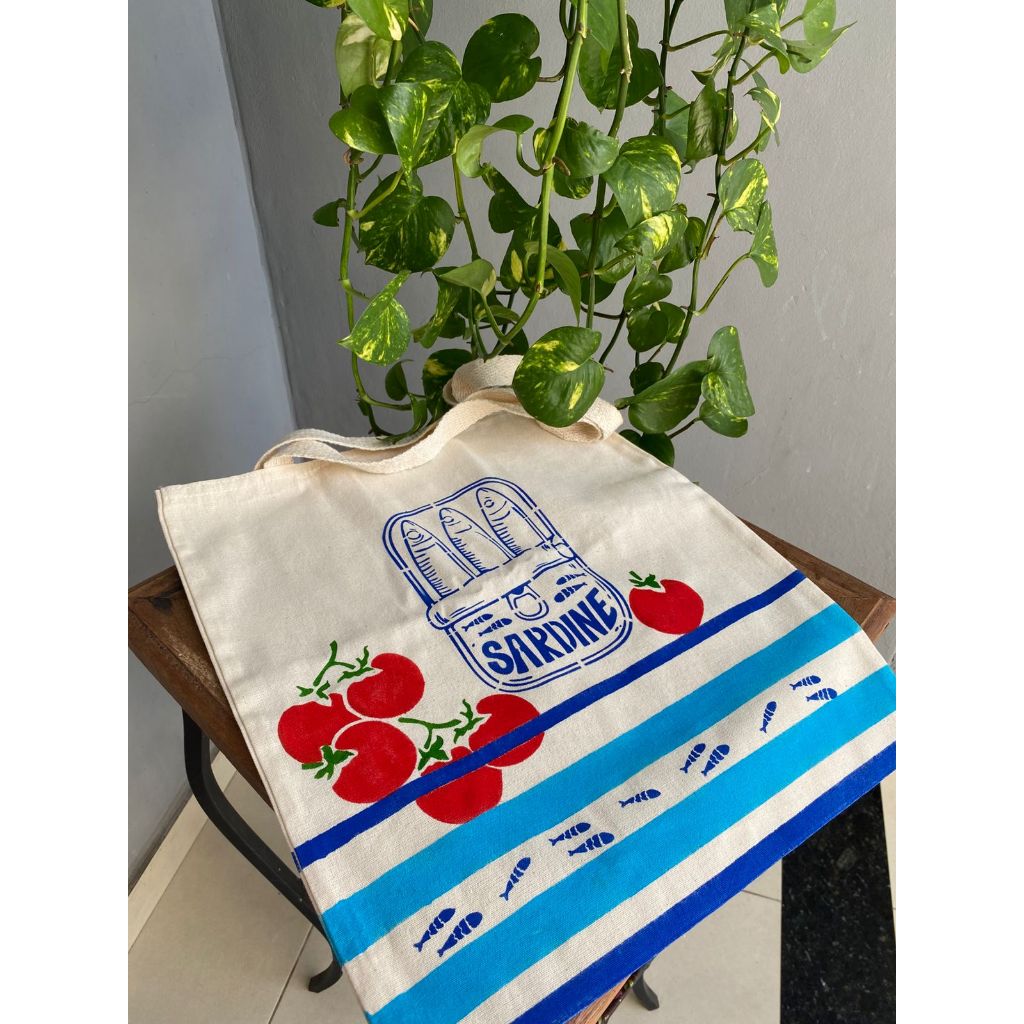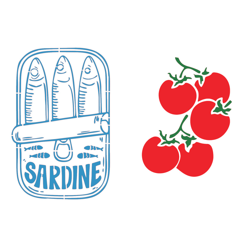 Stencil Lata de sardinha tomates peixes sardine, pintura em tecido, pano de prato artesesanato ecobag