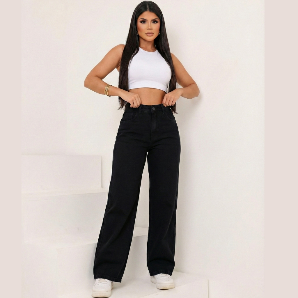 Calça Wide Leg Jeans Feminina Pantalona Cintura Alta 100% Algodão