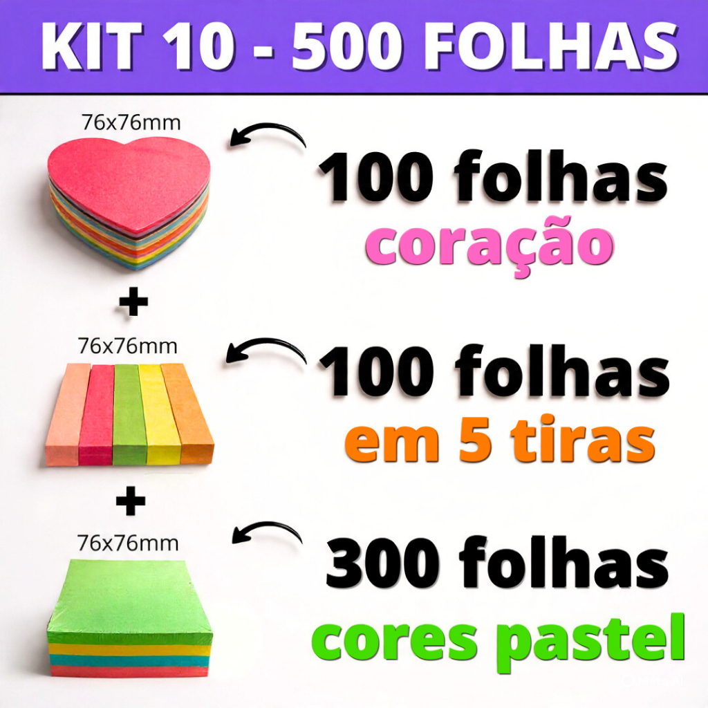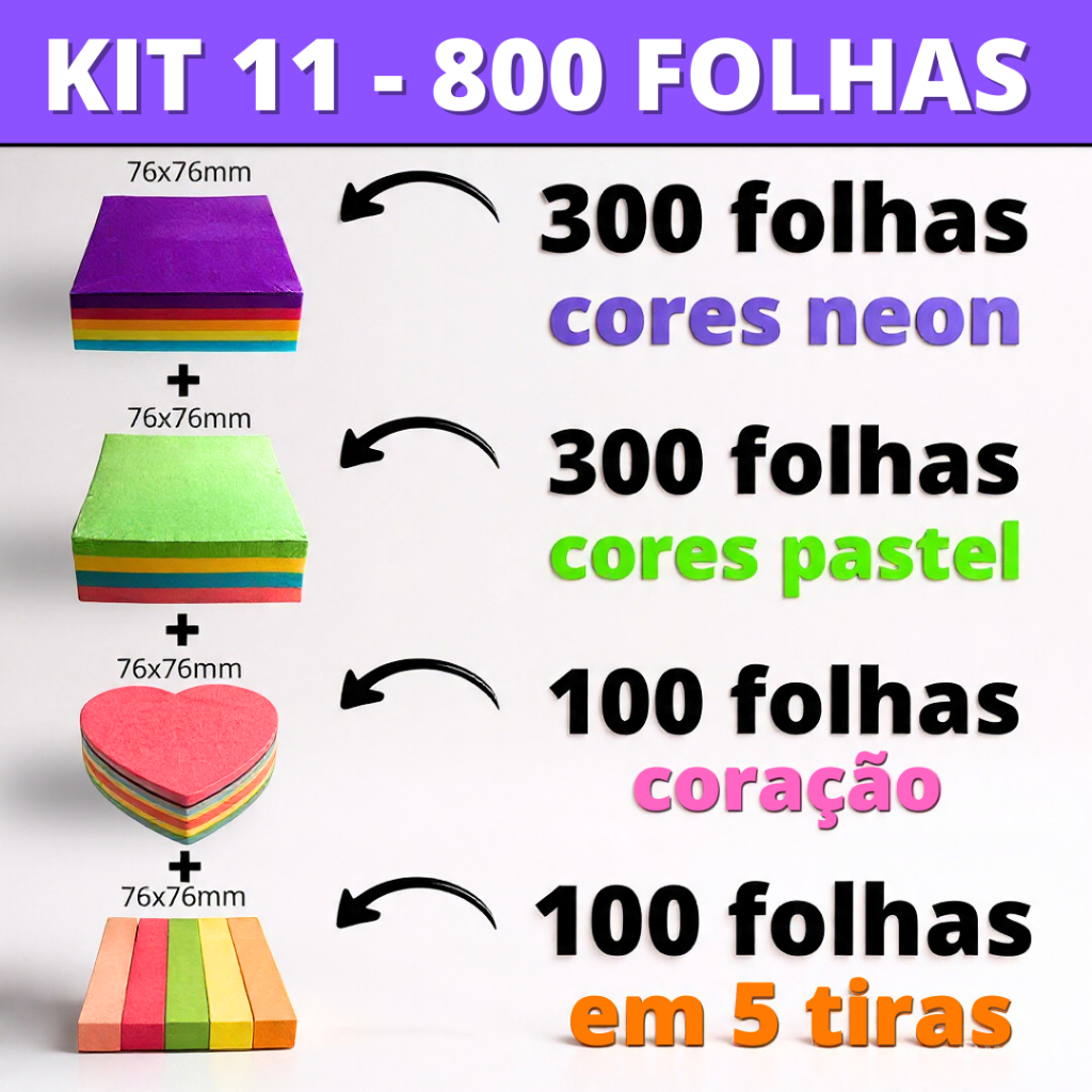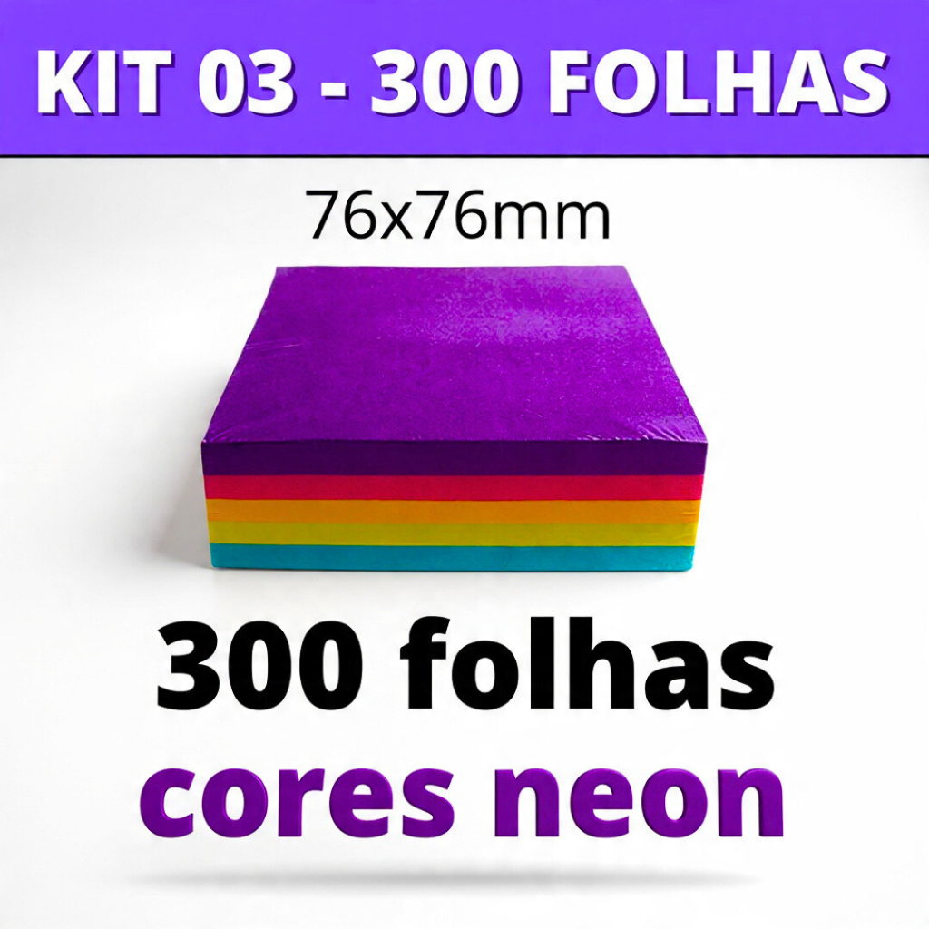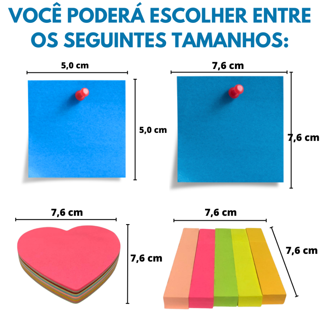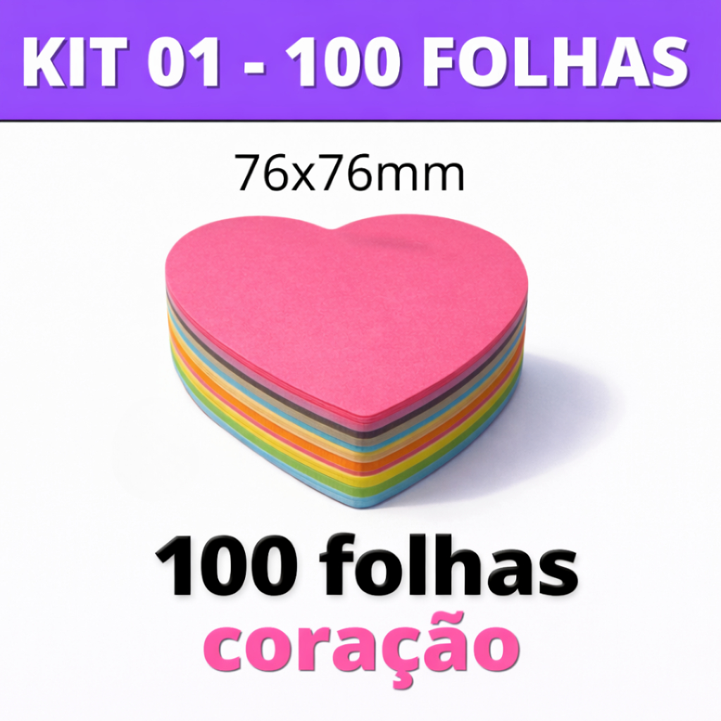 Kit Post it Até 800 Folhas Bloco de Notas Adesivo 50x50mm ou 76x76mm Colorido Pastel Neon Coração Sticks