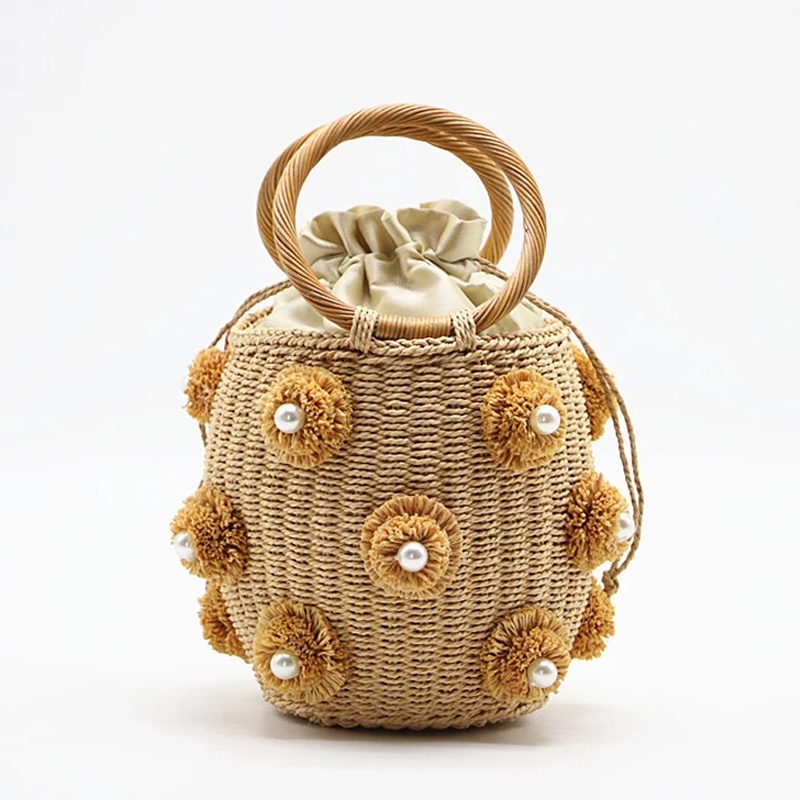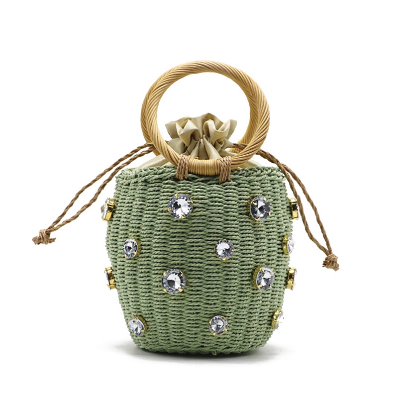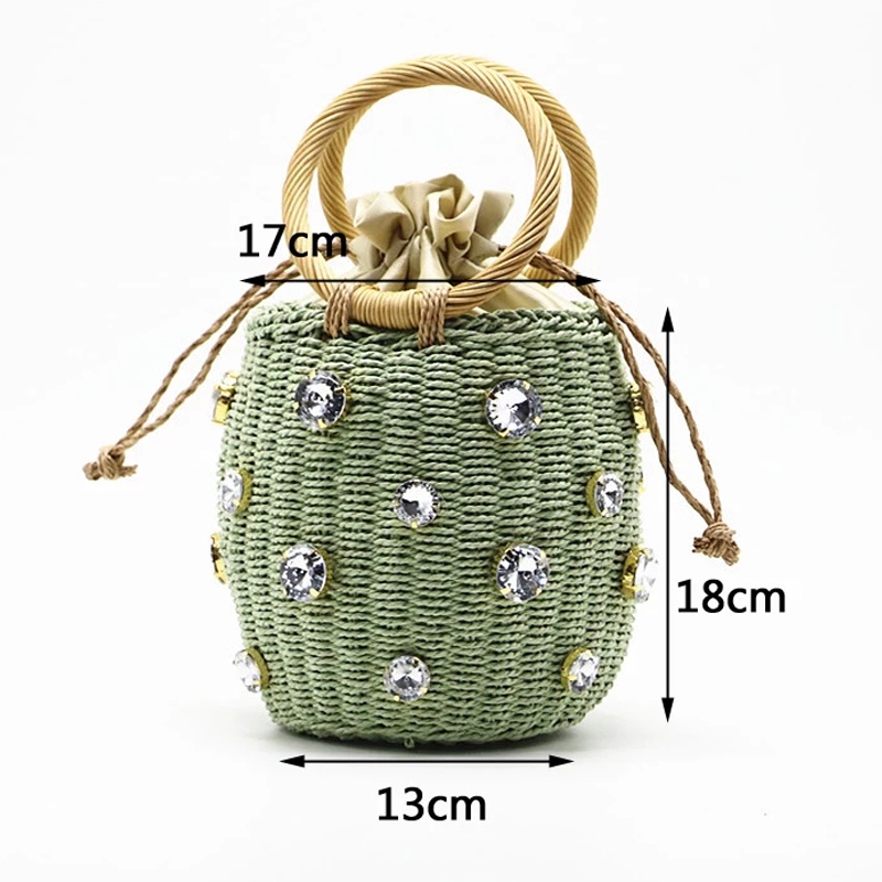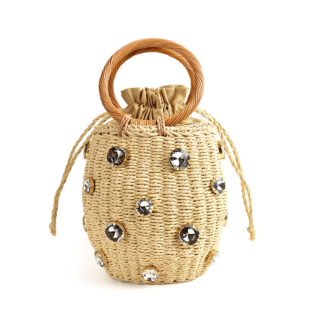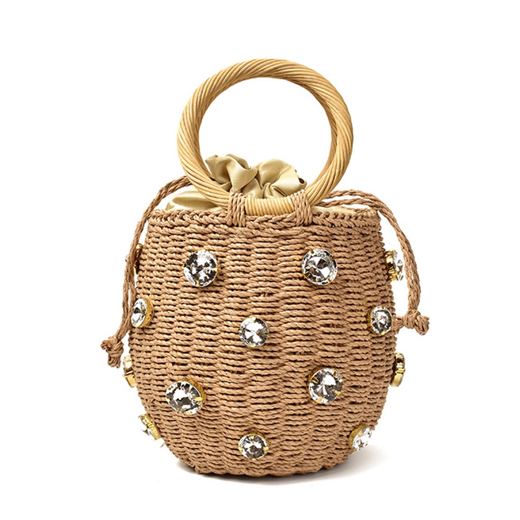 Bolsa De Palha Pequena Drawstring Tote Mala De Tricotar Artesanal Com Decoração Rhinestone Pulso De Praia De Verão Para Mulheres