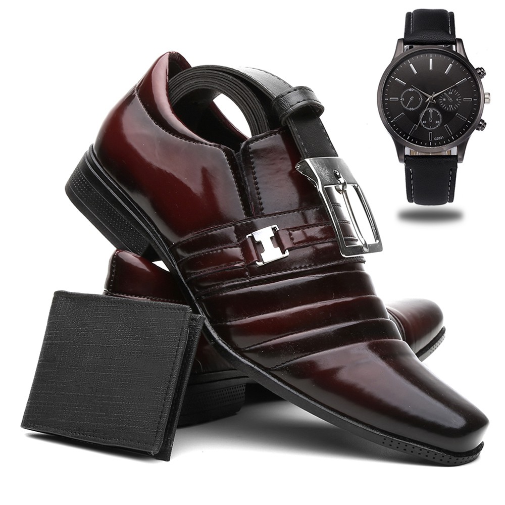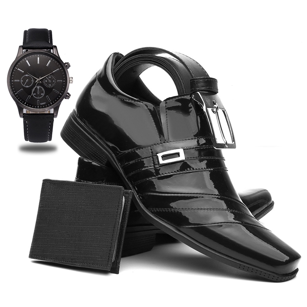 Sapato Social Masculino Verniz + Cinto + Carteira + Relógio de Ponteiro