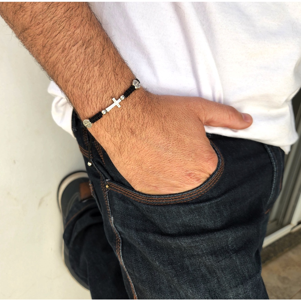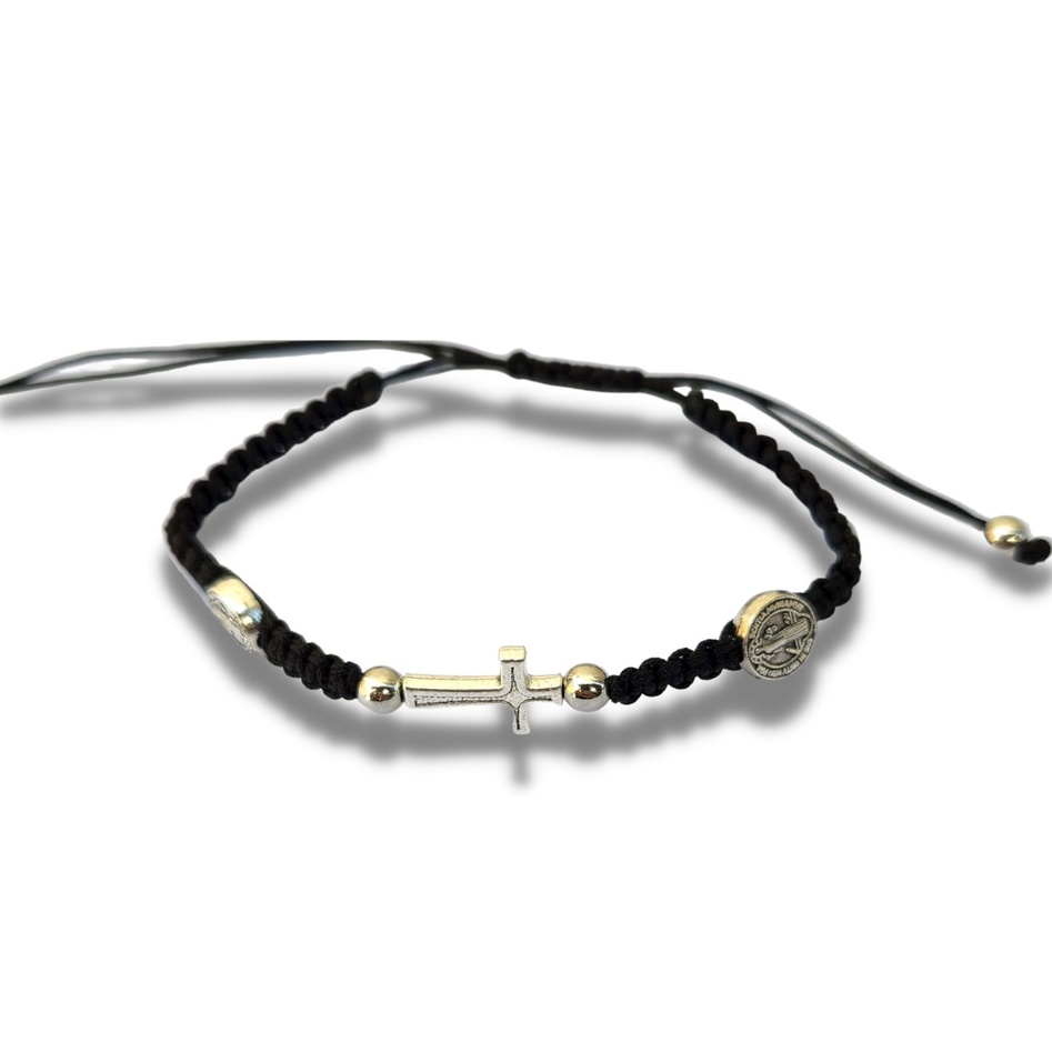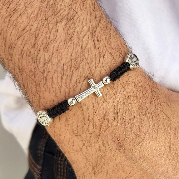 Pulseira Masculina medalha de São Bento Ajustável cordão encerado estilo religioso moda
