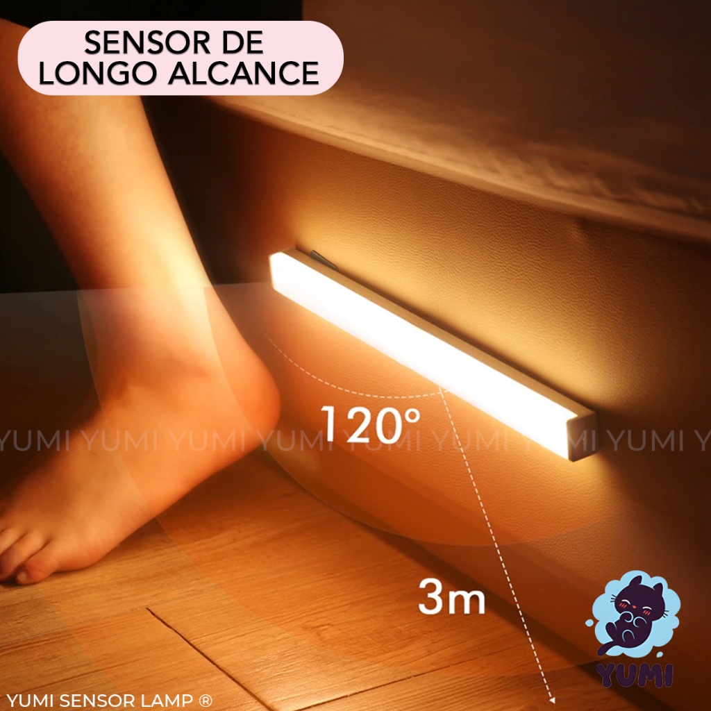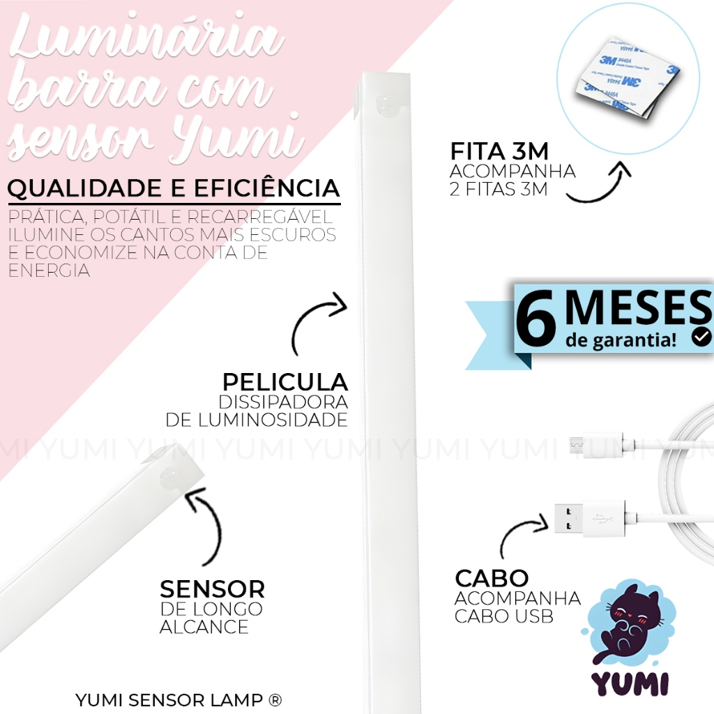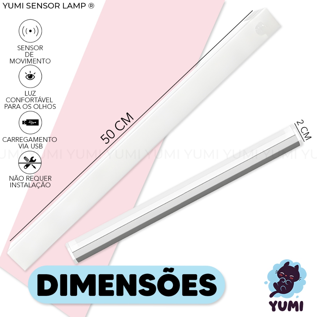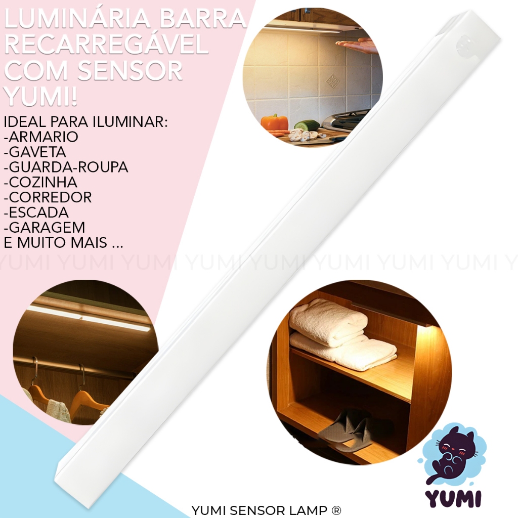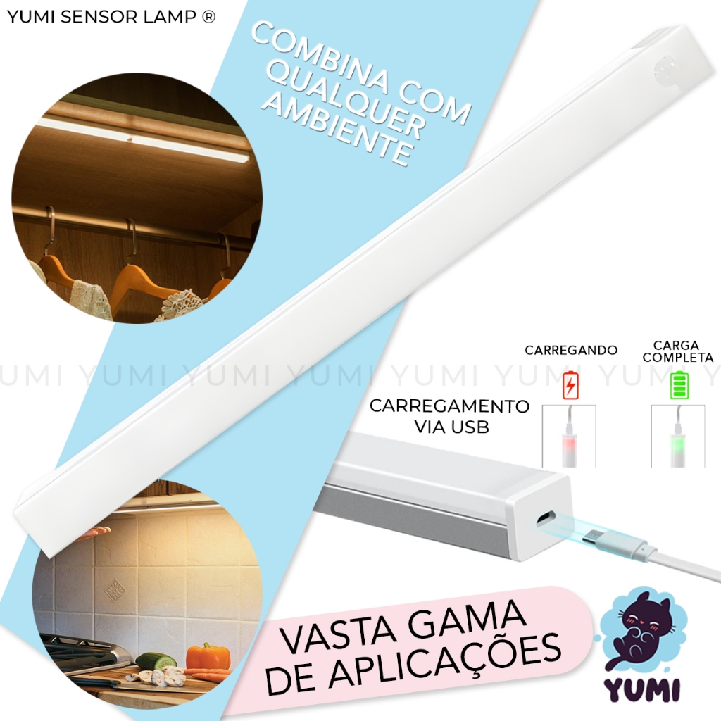 Luminária Sobrepor Led 50cm Tubular Branco Quente ou Frio C/ Sensor de Presença Recarregável USB Cozinha Closet Armários